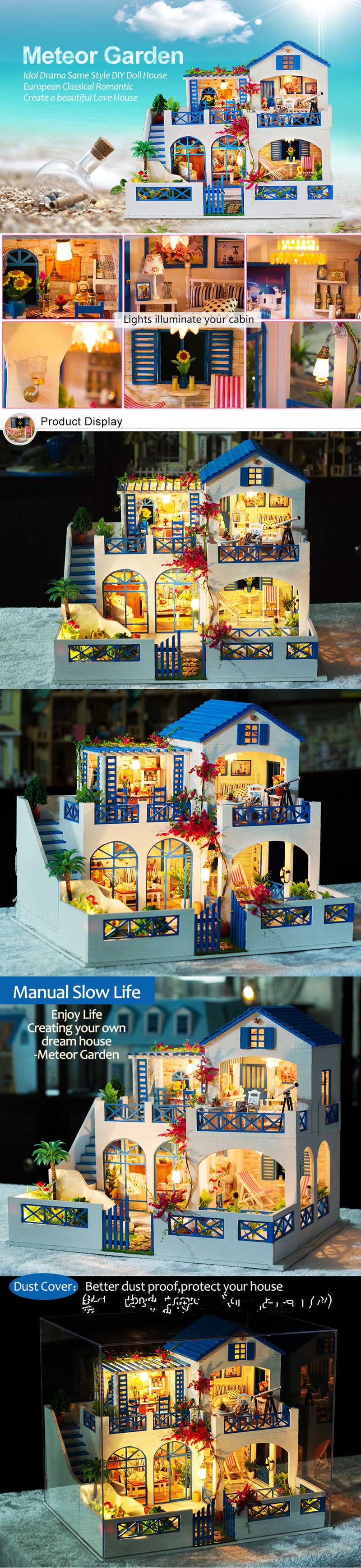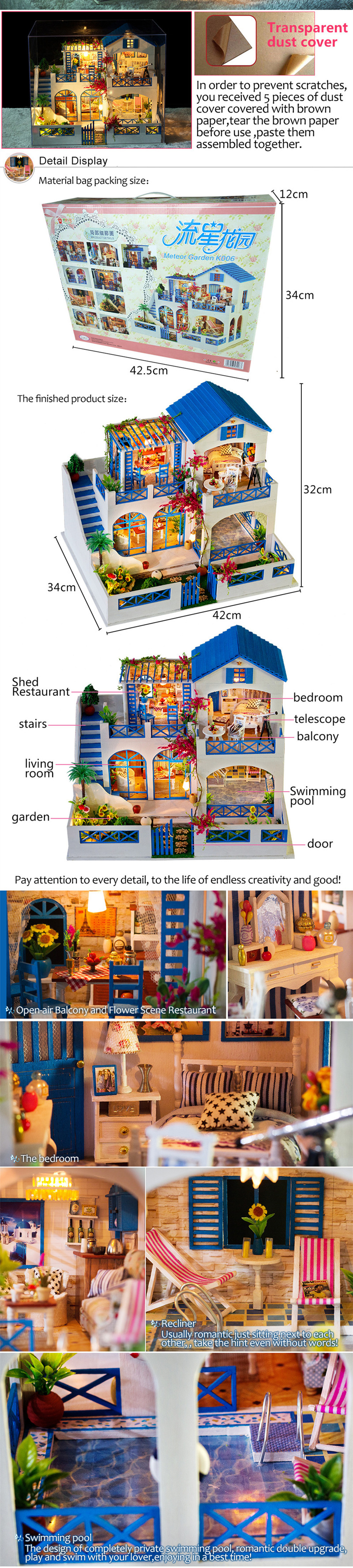 Description: Brand: iiecreate Item Name: Meteor Garden Item NO.: K-006 Type: DIY; NOT Pre-assembled Finished Size: 42*34*32cm Weight: 3.18kg Main Material: Wood, Paper, Light, etc. Light: Included Dust Cover: Included Music Motor: Included Glue: Not Included Pefect for: Gift, Home/Office Decor