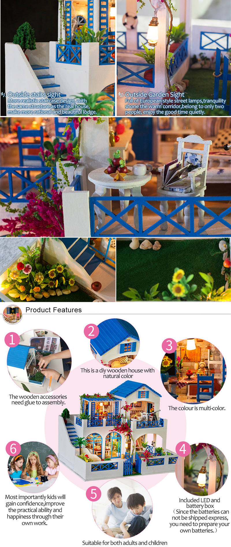Note: It is NOT a pre-assembled dollhouse. You need to assemble by yourself. It requires your patience. This kit contains small parts. Adults' guidance is required for young children.