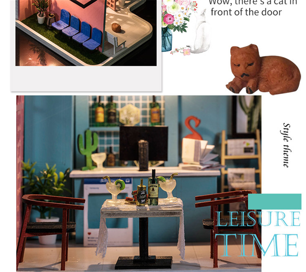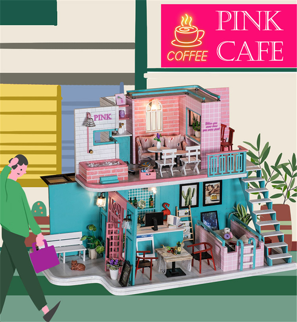 iiecreate K-034 Pink Cafe House 30*19*22CM DIY Doll House With Furniture Light Cover Gift Toy