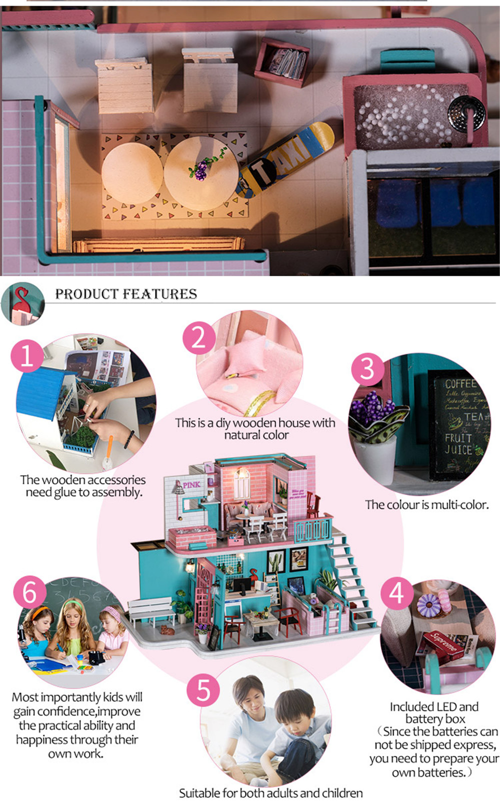 1 x Pink Cafe House DIY Dollhouse Kit (With Instructions & Small Accessories)
