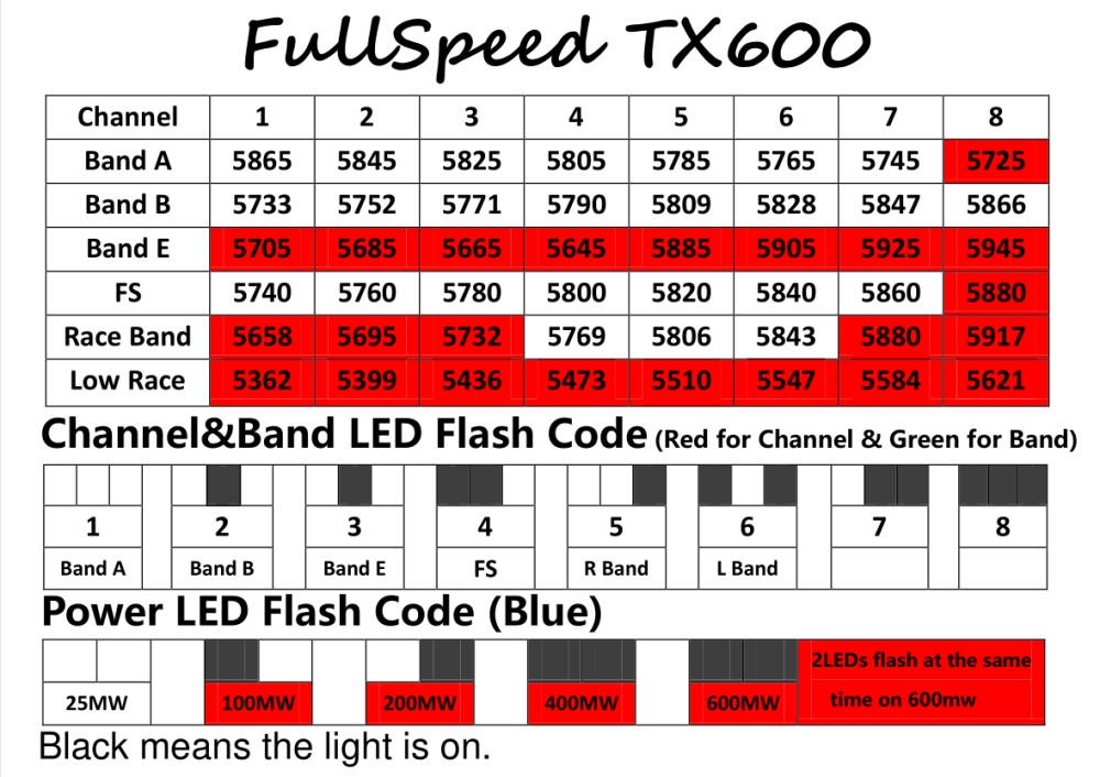 FullSpeed FSD TX600 25mW-600mW VTX FPV Transmitter Output power: PIT/25mW/100mW/200mW/400mW/600mW switchable Control mode: BFOSD control(RX)/button Video system: NTSC/PAL Antenna: IPEX BAT: 5V Recommended Frequency: 5.8GHz 6 bands 48 channels, with Raceband: 5362-5945 MHZ (TX600's factory set up is on lock mode(5733-5866MHZ unlock). Please follow your local laws and regulations if you need to unlock the frequency.) Size: 26*26mm(L*W),Hole:20*20mm Weight: 2.3g