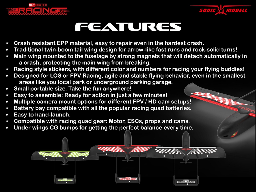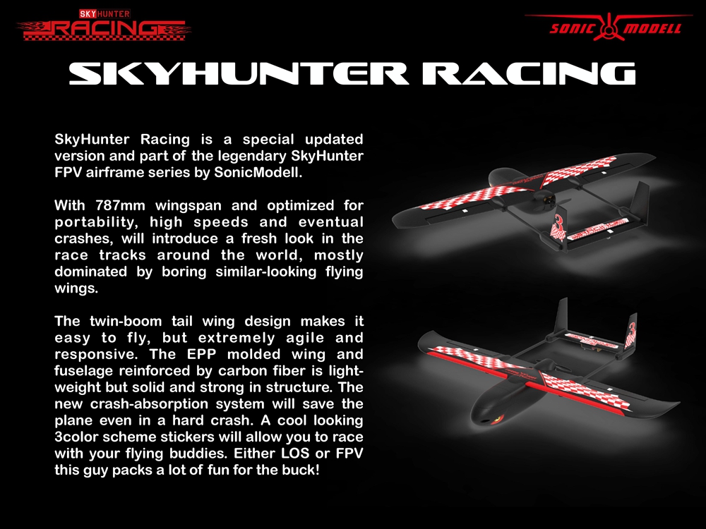 This 787mm Wingspan Skyhunter Racing is a special updated version for racing, also it is the smallest and most portable edition of the legendary Skyhunter FPV airframe series, the twin-boom tail wing design makes it fly super stable and agile, the EPP molded wing and fuselage reinforced by carbon fiber tube and rod is light in weight but solid and strong in structure, the new crash absorption system will save the plane even in a hard crash. You can take it anytime to any place and fly in anywhere because of its compact size and highly integrated power system.