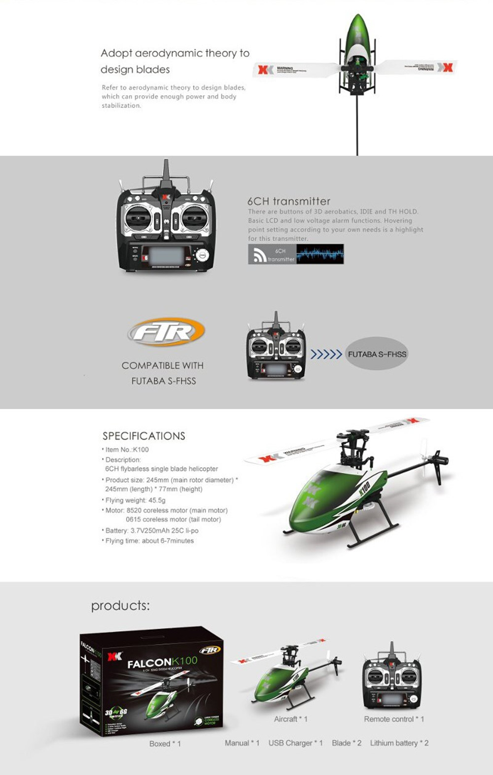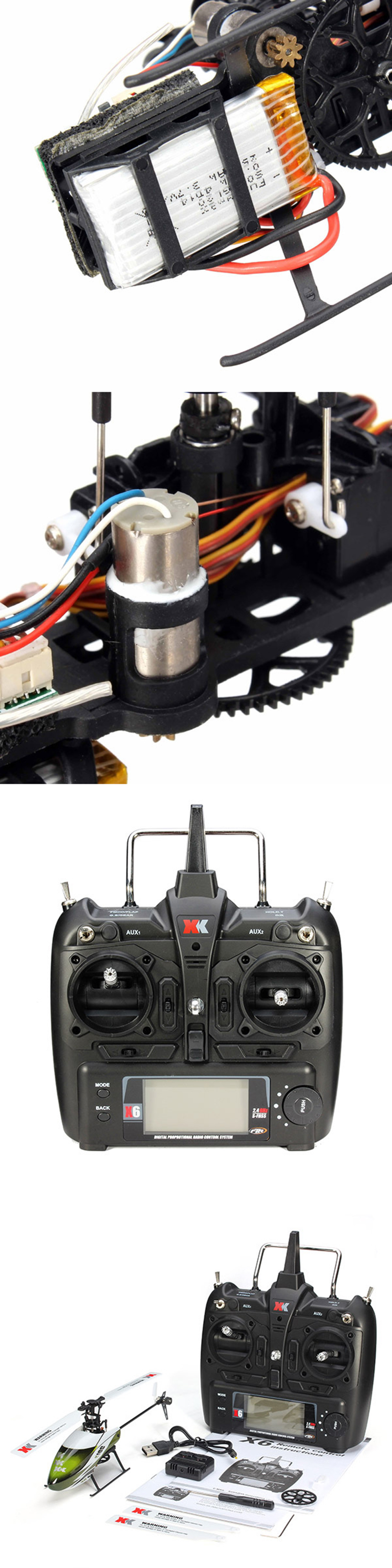 -6CH transmitter. There are buttons of 3D aerbatics, IDIE and TH HOLD. Basic LCD and lo voltage alarm functions. Hovering point setting according to your own needs is a highlight for this transmitter.
