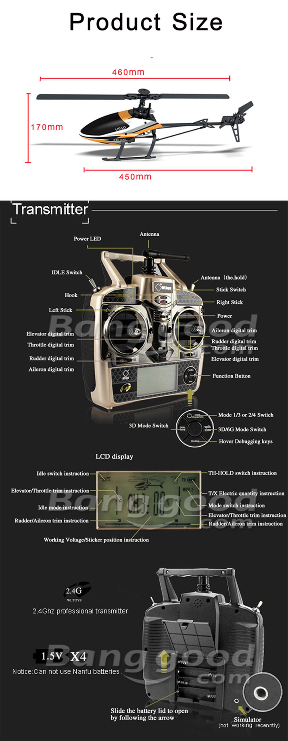 4. 6CH Transmitter has 3D aka Idle-Up switch, Throttle Hold switch, large LCD, low voltage warning.