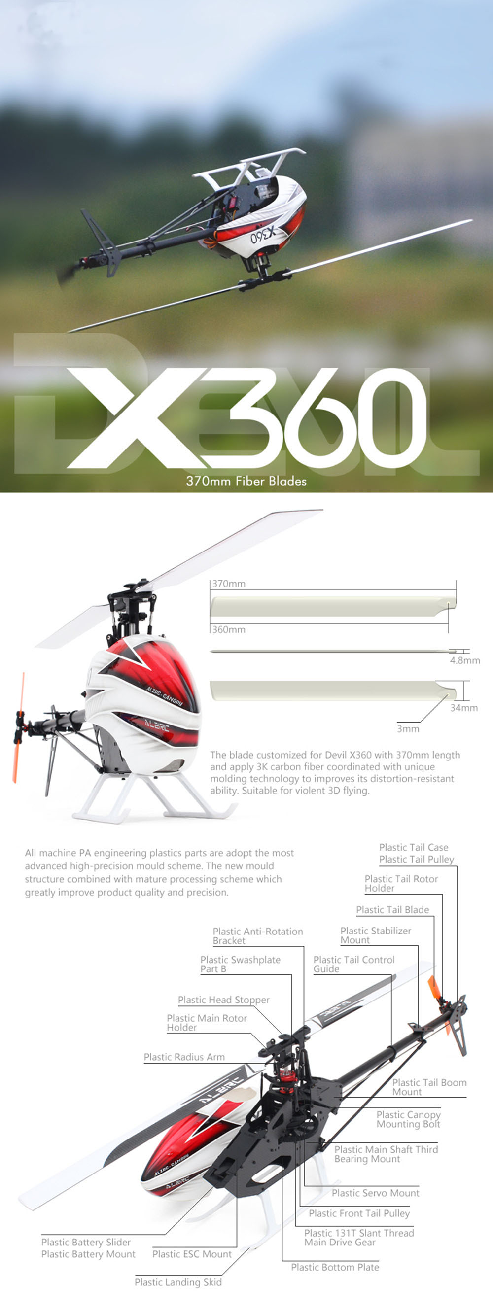 Features: - The blade is made of 3K carbon fiber (370mm length) coordinated with unique molding technology to improves ints distortion-resistant ability,suitable for violent 3D fly.