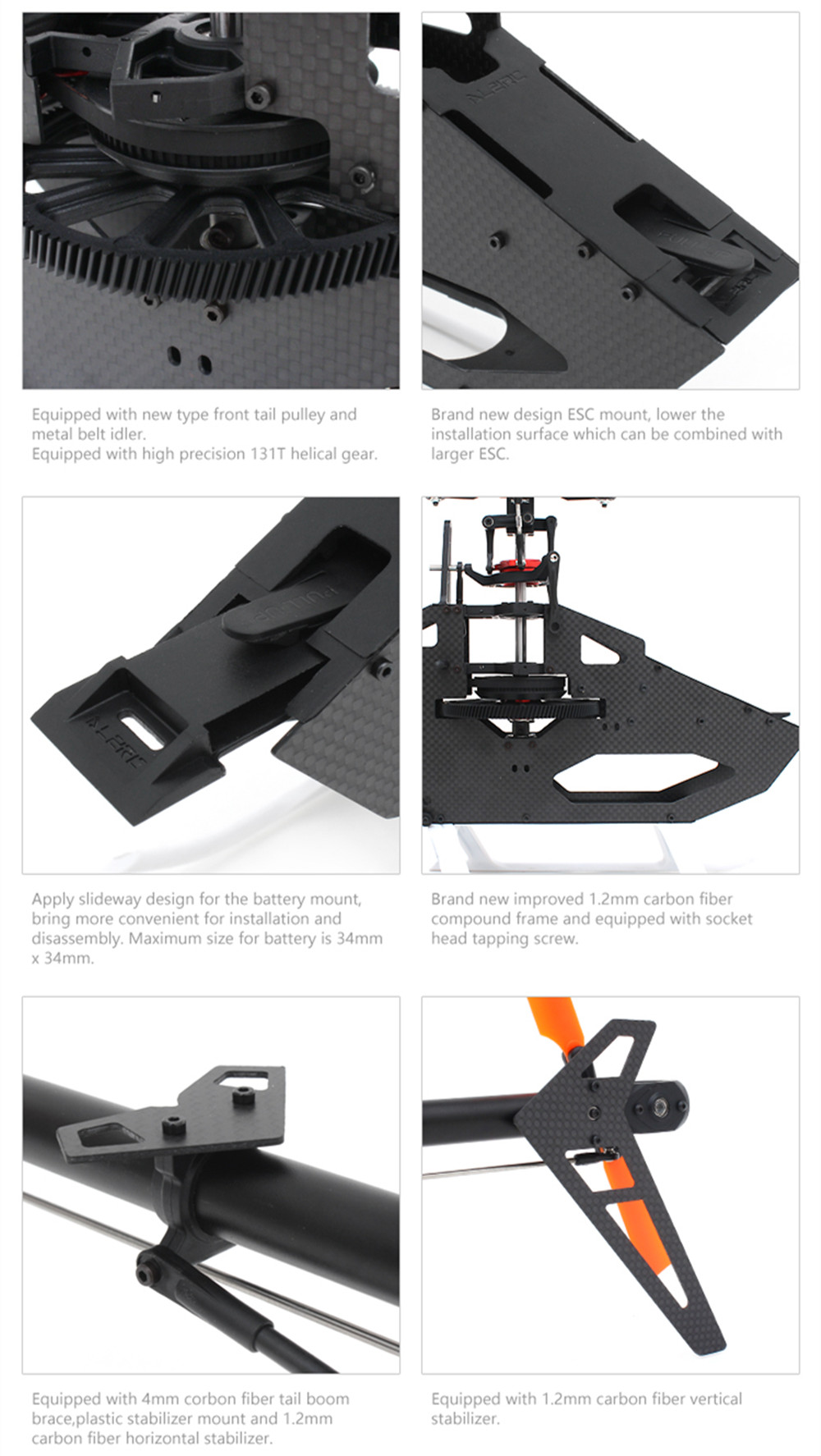 - Apply FBL rotor set and with diameter of 5mm for spindle shaft and 6mm for main shaft 6061-T6 main rotor housing working with precision CNC machining, enhanced the capacity of 3D flight.