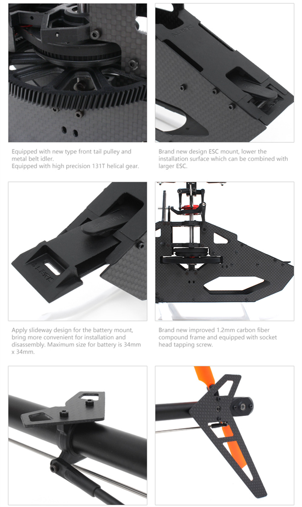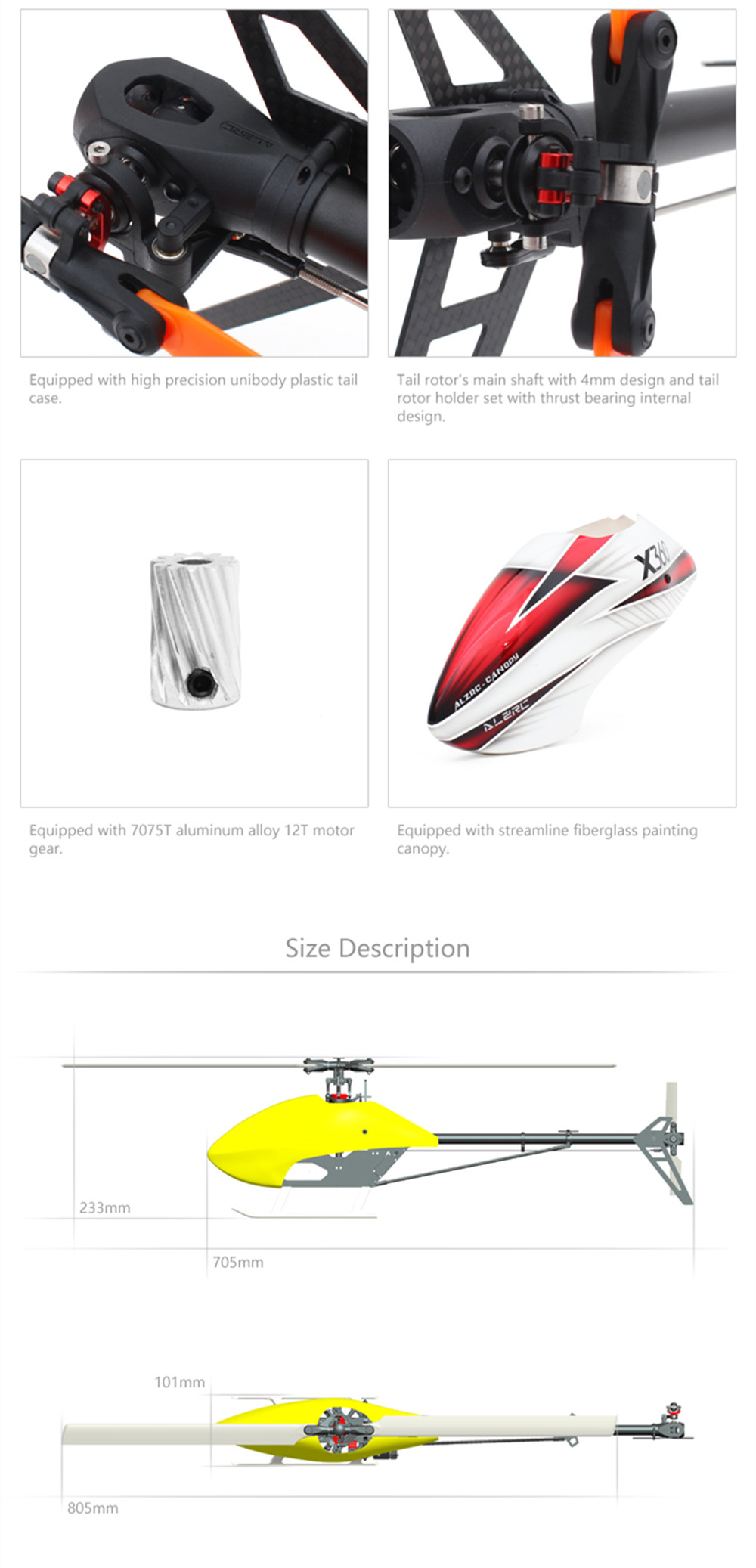 - Apply FBL rotor set and with diameter of 5mm for spindle shaft and 6mm for main shaft 6061-T6 main rotor housing working with precision CNC machining, enhanced the capacity of 3D flight.