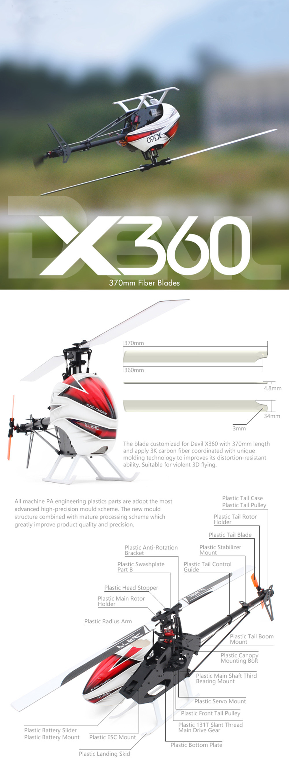 - The blade is made of 3K carbon fiber (370mm length) coordinated with unique molding technology to improves ints distortion-resistant ability,suitable for violent 3D fly.