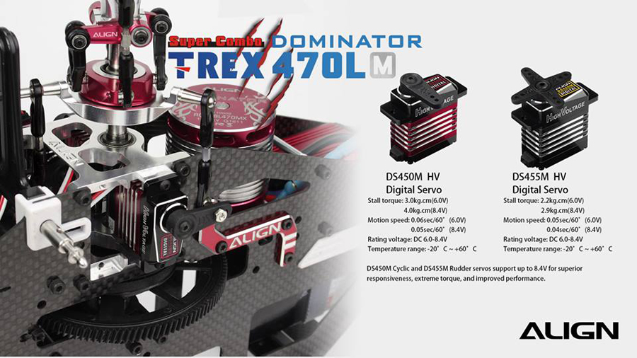 - DS450M Cyclic and DS455M Rudder servos support up to 8.4V for superior responsiveness,extreme torque,and improved performance.