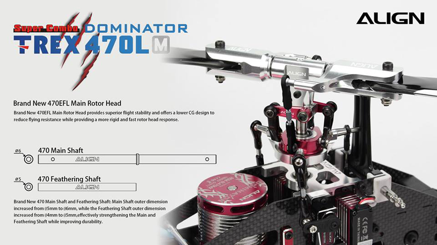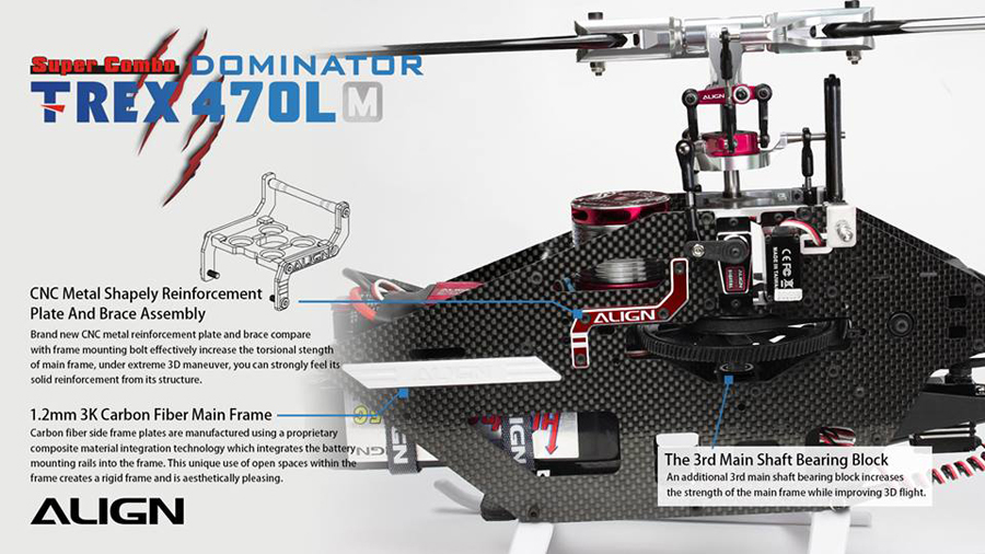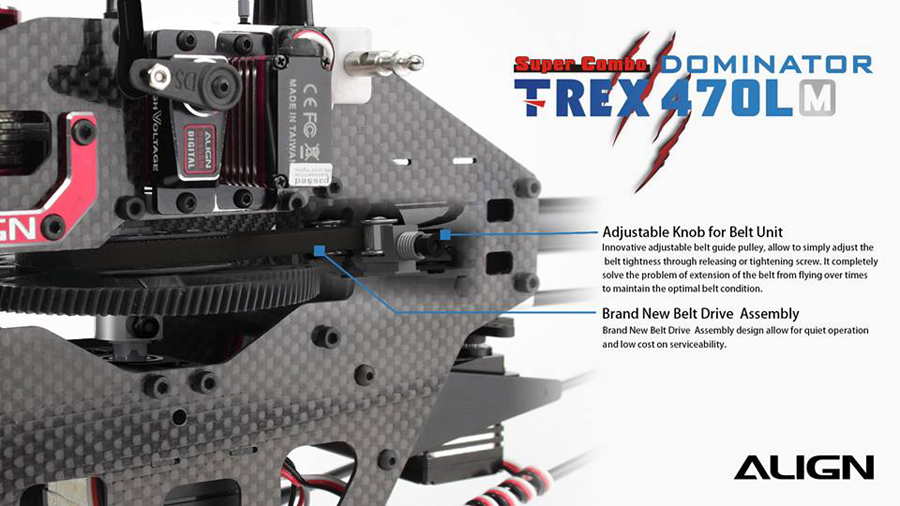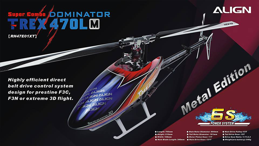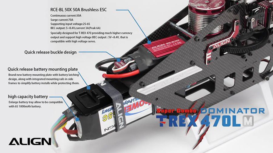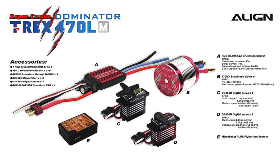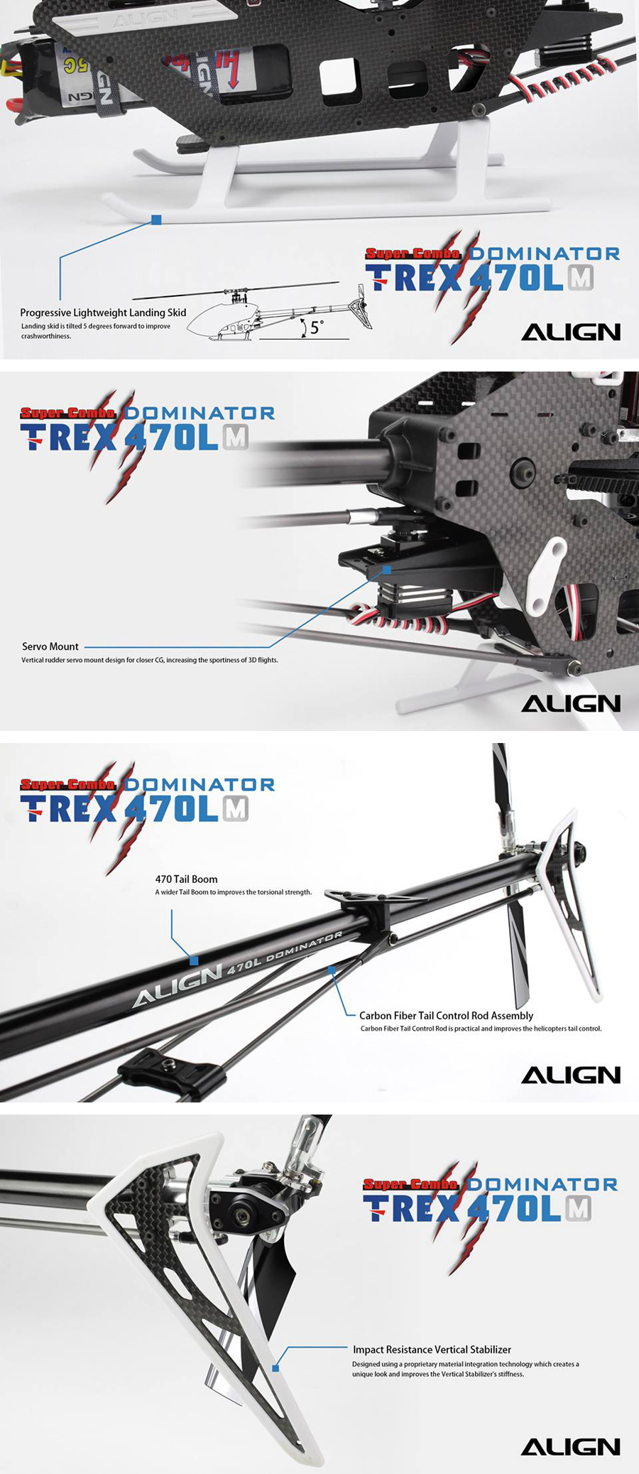 Align T-REX 470LM Dominator RC Helicopter RH47E01XT Super ComboDescription:The new T-Rex 470LM is the latest release from one of the most popular companies in the RC helicopter market. Some of the new features on the 470LM are the newly designed belt drive system (a release of a torque tube version is on the way), new rotor head design that loses the DFC system. The new landing gear gives the helicopter a 5 degree forward tilt and the servos are the new HV DS450M/HV DS455M High voltage versions. The ESC is the new RCE-BL50X to handle the 6 cell power system and the main shaft has an added 3rd bearing in the main block. All of which makes the 470LM Dominator Super combo an excellent choice for taking the guesswork out of choosing the electronics for your 3D power house.