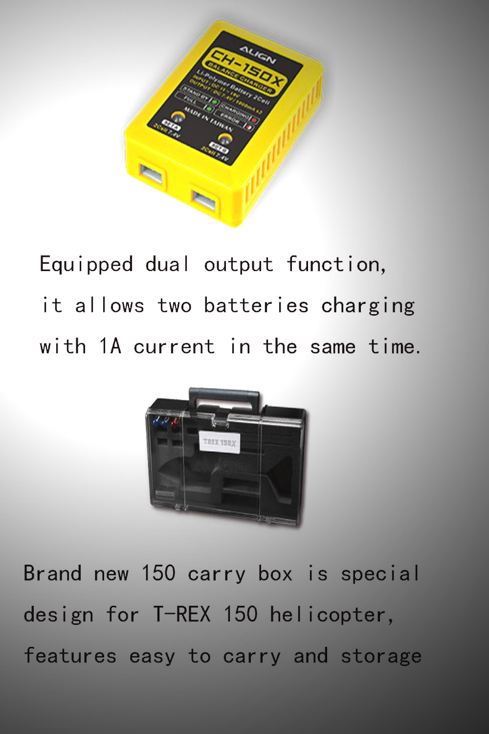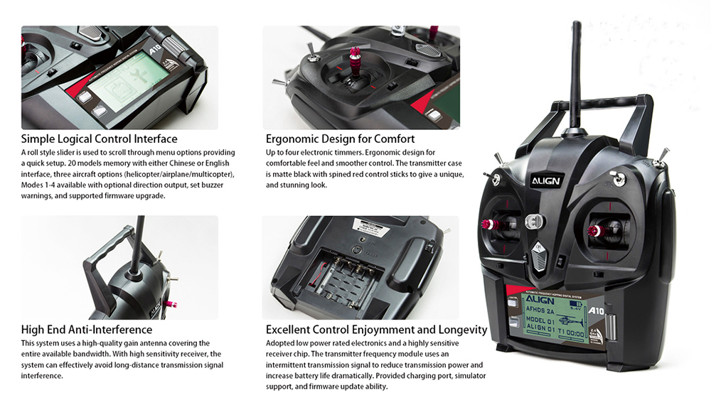 1 x Parts Box E(78.5x60.9x21mm) 1 xParts Box A(52x40x12mm) 1 x ALIGN T10 Transmitter 1 x CH150X Lipo Battery Charger