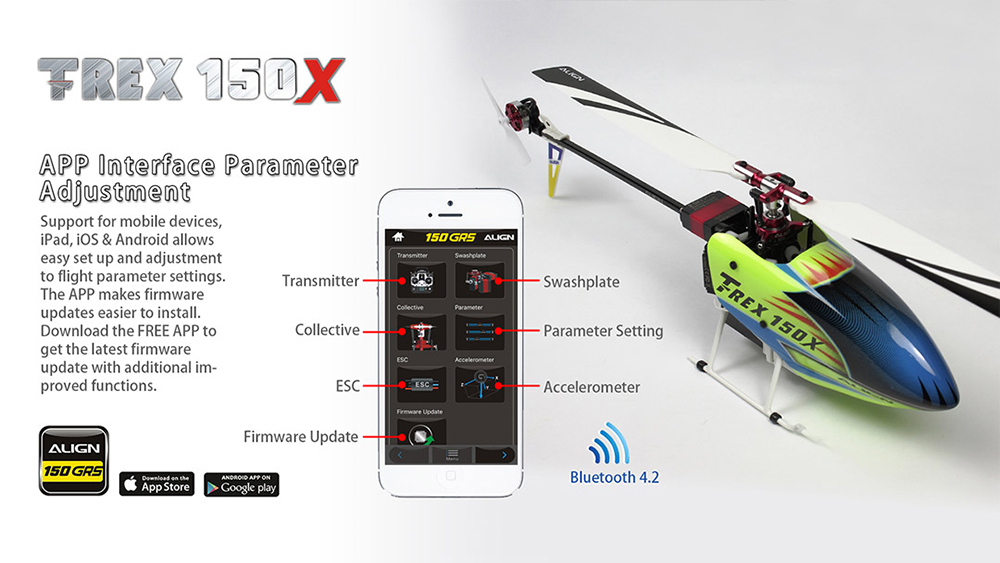 Feature: 1. Mini 3D helicopter with strong power, stable flight system, excellent appearance and super accessories. 2. The system Integrates 6-aixs gyro, receiver, ESC and bluetooth4.2, could be adjusted flying settings by App. 3. Support ios, android and ipad to adjust the flying settings at anytime. 4. Upgrade the system by FREE App, easy and convenient. 5. The Main motor(9000kv) is powerful, high efficiency and low energy comsuption. 6. Control by ALIGN A10 transmitter, dual ball bearing design to meet customer's demand better.