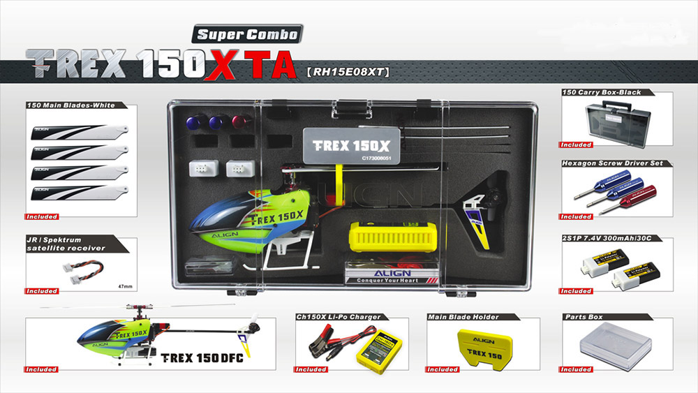 Package: 1 x T-REX 150X TA DFC Set 2 Sets x 150 Main Blades 1 Set x 150 Tail Blades 1 x 150m Main Motor(9000kv/1107) 1 x 150m Tail Motor(8000kv/1103) 1 x DS155 Digital Servo 2 x DS150 Digital Servo 1 x 150 Remote Extension 2 x 7.4v 300mAh/30C Lipo Battery 1 x 150 Carry Box (Black 292x160x69mm) 2 x 1.3mm Hexagon Screwdrive (Blue/8.2g)