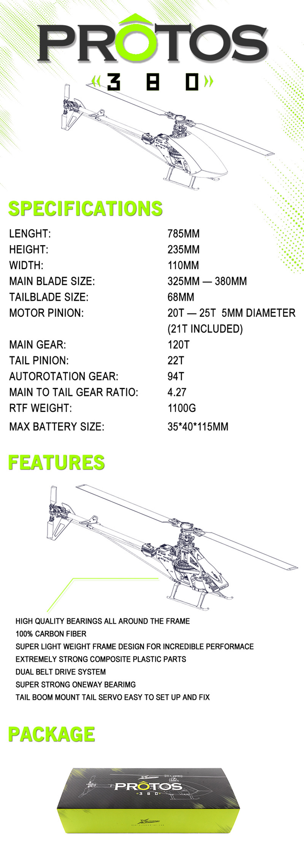 XLPower MSH PROTOS 380 FBL 6CH 3D Flying RC Helicopter Kit Without Main Blade