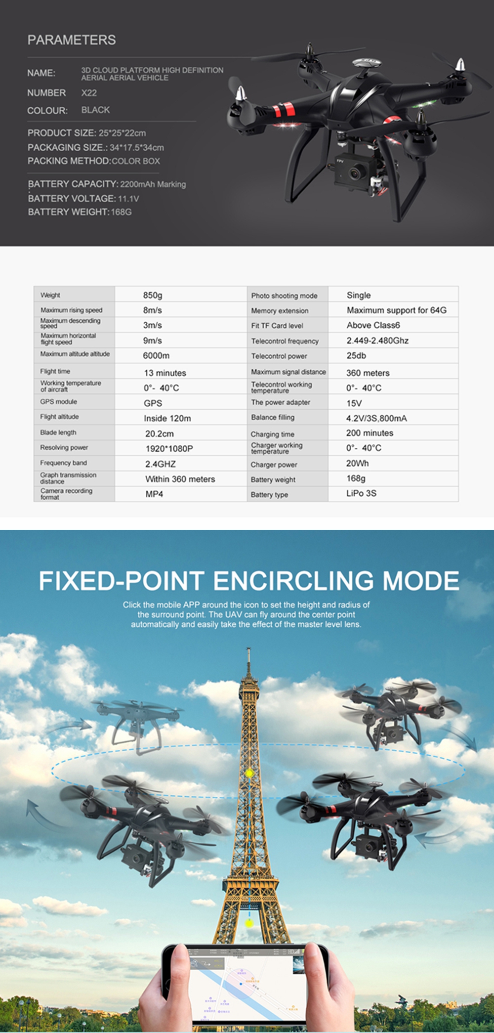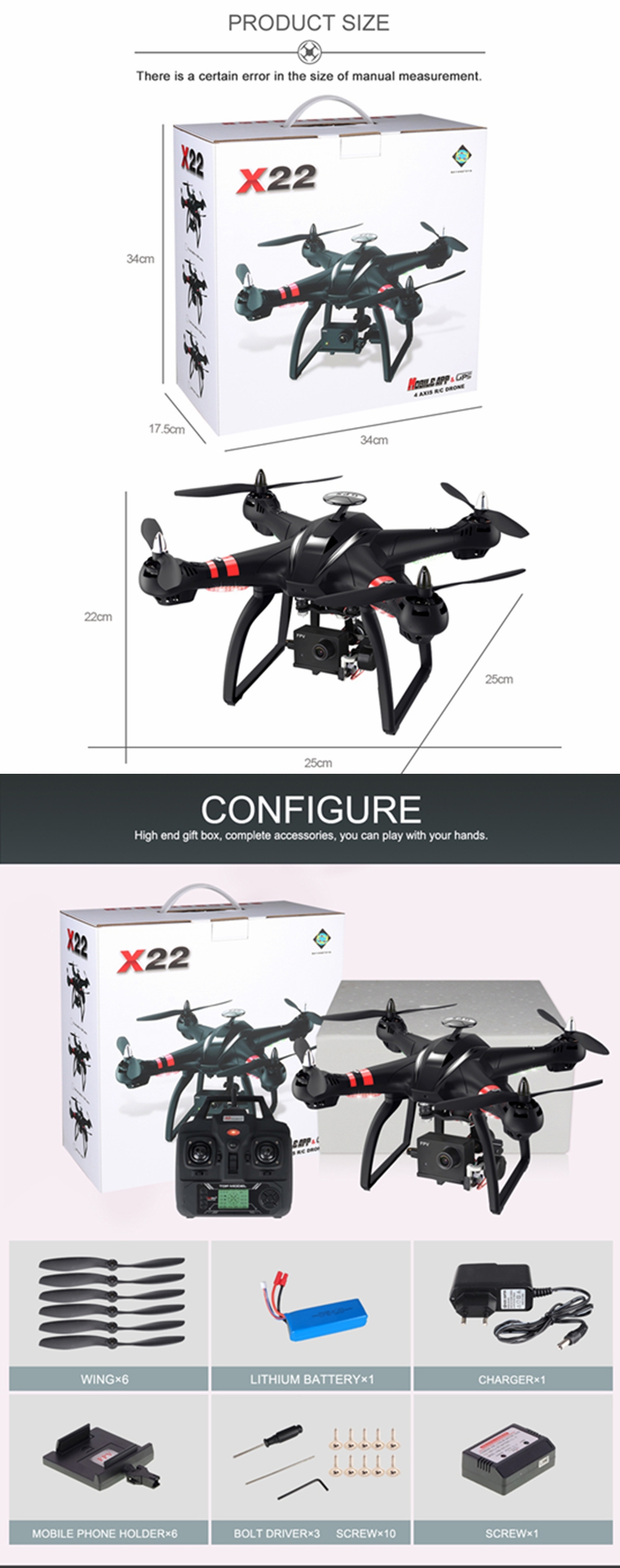 Note: The Battery 2200mah has been update to 3200mah. The flight time of 3-axis Gimbal can be up to 16 minutes, the ordinary Gimbal can be up to 20mins. But it should be noted that the previous drone with 2200mah Battery can not use this new 3200mah battery. Because the old receiver board is not supported.
