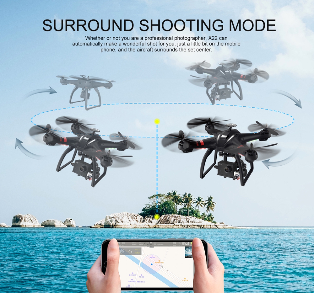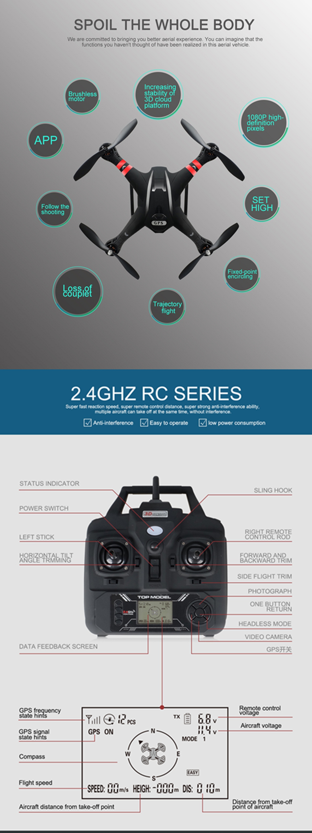 Features: - Built-in Dual GPS System,enable precise Position / Altitude Hold, Follow Me and Point of Interest outdoors. - Take 1080P HD videos and transmit FPV within 320-430m by the HD Wide-angle 1080P camera. - The 8MP camera stabilized by 3-Axis gimbal. - With automatic return function, the quadcopter will automatic returning and landing when lost connection or signal received interference. - Surround Feature.Select a center point,set the flight height and radius of flight,the UAV can automatically fly around the center point,easy to shoot a master lens effect. - With Follow Me, the aircraft will automatically follow you and capture your every move from a unique aerial perspective.
