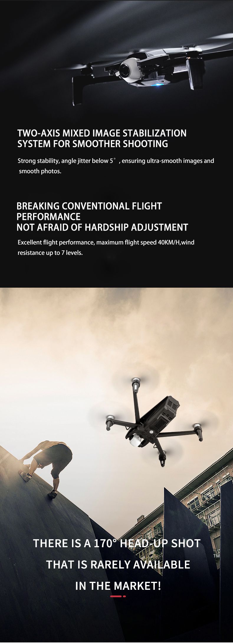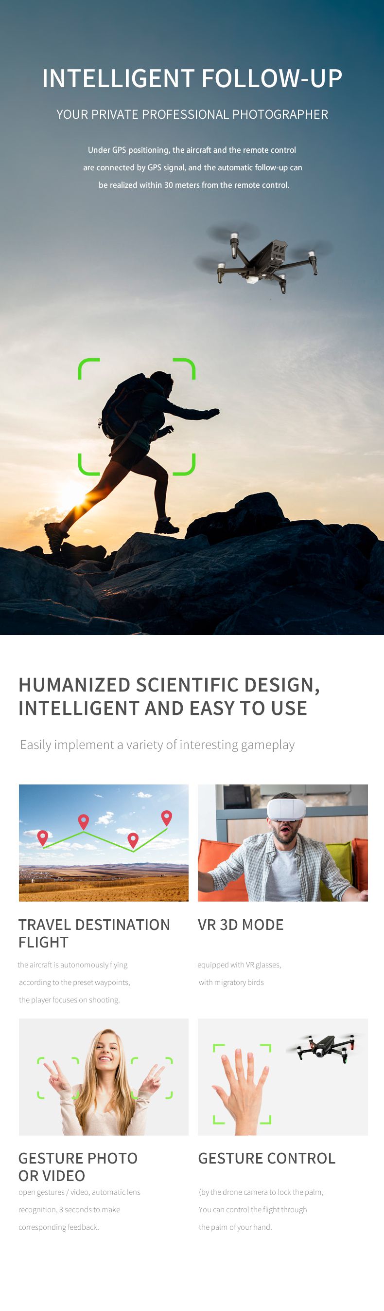 - GPS intelligent image follow: recognize the subject and perform automatic follow flight.