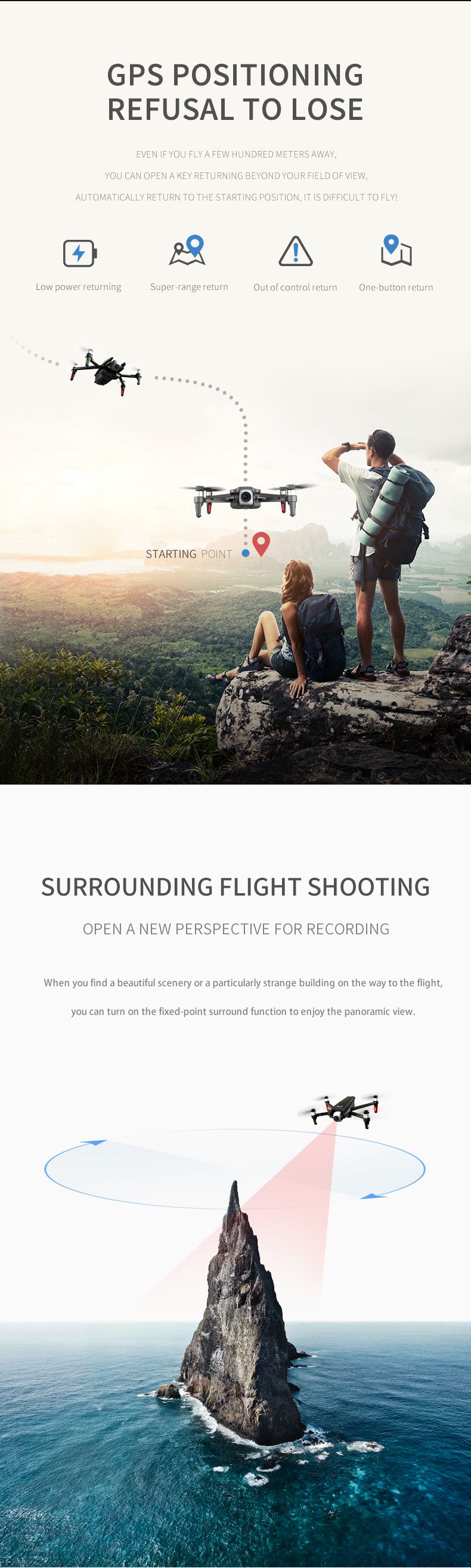 - GPS One-button/low-voltage/control loss returns to the home: In the event of an emergency, the automatic RTF function will automatically trigger, track the drone and return safely.