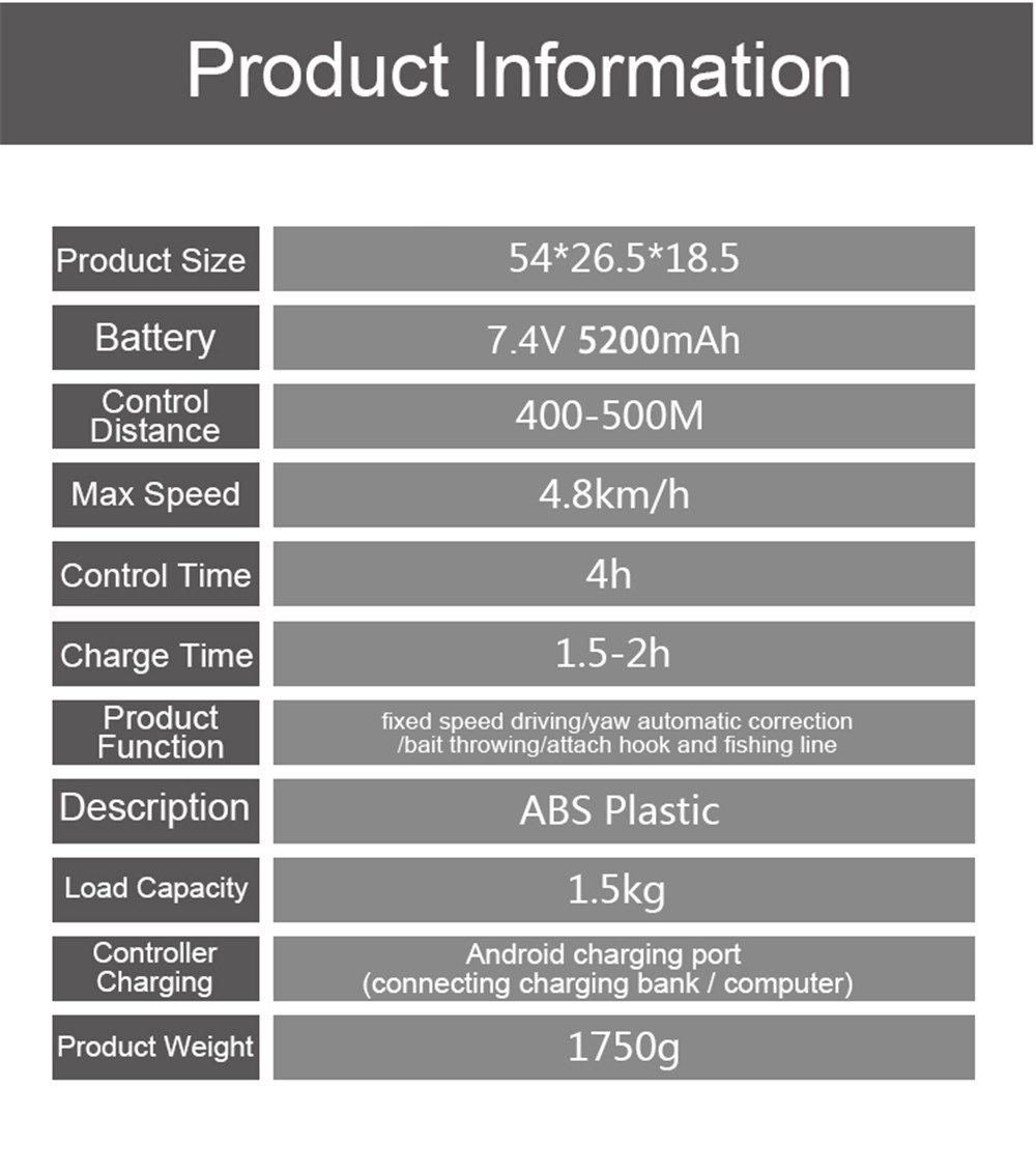 Product Function: Forward/backward/left turn/right turn fixed speed driving yaw automatic correction bait throwing attach hook and fishing line/ LED searchlight remote control can be one hand controlled low battery warning