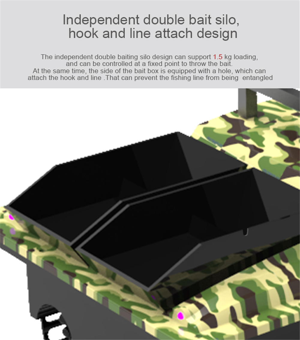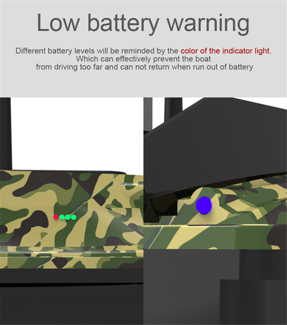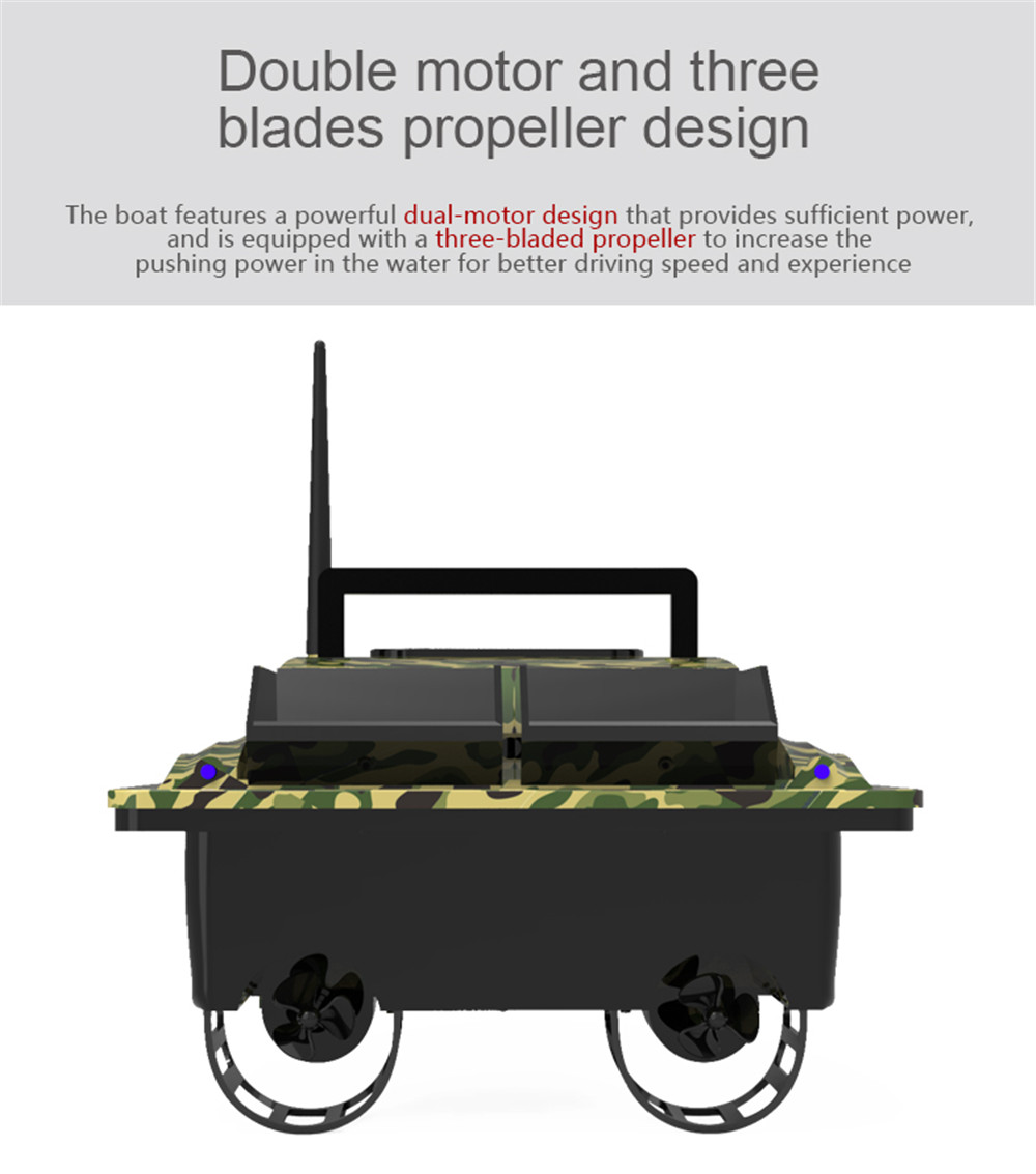 Feature: 1. ABS engineering material is molded from the main body of the hull The boat body of the hull is made of ABS engineering material at one time.It has superior impact resistance and wear resistance, is not easy to wear, has strong scratch resistance, beautiful, strong and stable, strong wind and wave resistance. 2. Fixed speed driving The Fixed speed driving function is integrated into controller, so that the bait boat can go straight at a constant speed, and the operation is simple, saving time and labor; 3. Yaw automatic correction It has an automatic balance adjustment system, which can effectively control the driving direction of the boat and keep driving straightto avoid excessive yaw due to wind and waves; 4. Long distance strong signal receiving system Remote controller can be achieved the signal without blocking in 400-500 meters. 5. Double motor and three propeller design The boat features a powerful dual-motor design that provides sufficient power, and is equipped with a three-bladed propeller to increase the pushing power in the water for better driving speed and experience. 6. Independent double bait silo, hook and line attach design The independent double baiting silo design can support 1.5 kg loading, and can be controlled at a fixed point to throw the bait. At the same time, the side of the bait box is equipped with a hole, which can attach the hook and line .That can prevent the fishing line from being entangled. 7. Waterproof grass double motor design Powerful dual-motor design with waterproof cover design to prevent interference from propellers. 8. Low battery warning Different battery levels will be reminded by the color of the indicator light. The low-power warning function can effectively prevent the boat from driving too far and can not return when run out of battery; 9. Remote control one-hand control design The remote control is designed to be small and easy to operate with one hand; 10. Large capacity battery, long battery life It is equipped with a 5800mAh large-capacity lithium battery, which is fast charging and the boat has 3-4 hours control time. The built-in protection board effectively improves the safety of use and prolongs the battery life; 11.LED searchlight Improve the field of view at night, correctly identify the direction, and ensure that the position to bait; 12. Strong wind resistance The design of the single streamline hull, the whole ship has been waterproofed, can effectively prevent all kinds of water leakage phenomenon,it can travel in the level 3-4 wind!