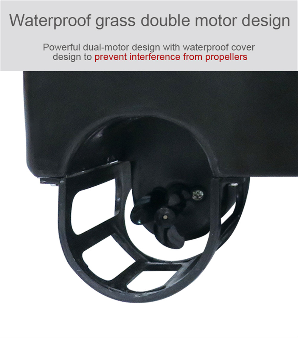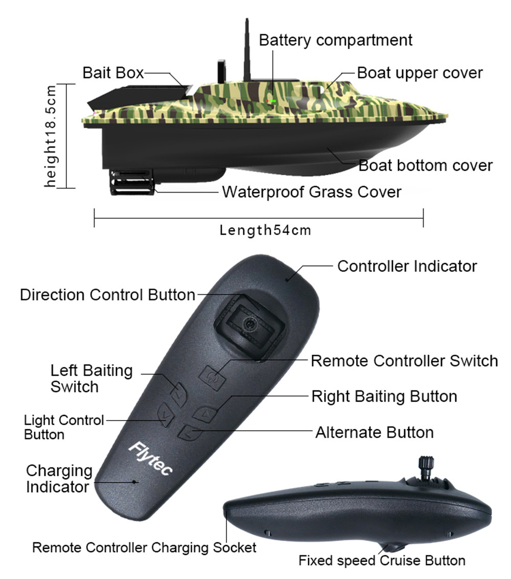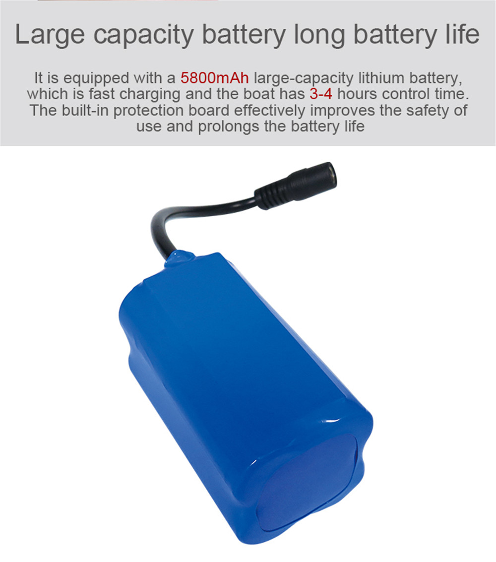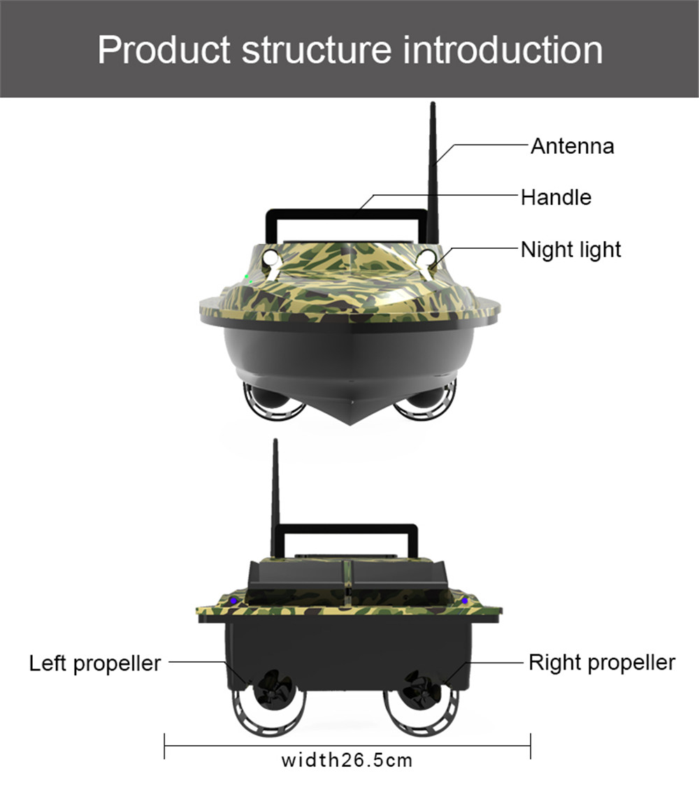 Feature: 1. ABS engineering material is molded from the main body of the hull The boat body of the hull is made of ABS engineering material at one time.It has superior impact resistance and wear resistance, is not easy to wear, has strong scratch resistance, beautiful, strong and stable, strong wind and wave resistance. 2. Fixed speed driving The Fixed speed driving function is integrated into controller, so that the bait boat can go straight at a constant speed, and the operation is simple, saving time and labor; 3. Yaw automatic correction It has an automatic balance adjustment system, which can effectively control the driving direction of the boat and keep driving straightto avoid excessive yaw due to wind and waves; 4. Long distance strong signal receiving system Remote controller can be achieved the signal without blocking in 400-500 meters. 5. Double motor and three propeller design The boat features a powerful dual-motor design that provides sufficient power, and is equipped with a three-bladed propeller to increase the pushing power in the water for better driving speed and experience. 6. Independent double bait silo, hook and line attach design The independent double baiting silo design can support 1.5 kg loading, and can be controlled at a fixed point to throw the bait. At the same time, the side of the bait box is equipped with a hole, which can attach the hook and line .That can prevent the fishing line from being entangled. 7. Waterproof grass double motor design Powerful dual-motor design with waterproof cover design to prevent interference from propellers. 8. Low battery warning Different battery levels will be reminded by the color of the indicator light. The low-power warning function can effectively prevent the boat from driving too far and can not return when run out of battery; 9. Remote control one-hand control design The remote control is designed to be small and easy to operate with one hand; 10. Large capacity battery, long battery life It is equipped with a 5800mAh large-capacity lithium battery, which is fast charging and the boat has 3-4 hours control time. The built-in protection board effectively improves the safety of use and prolongs the battery life; 11.LED searchlight Improve the field of view at night, correctly identify the direction, and ensure that the position to bait; 12. Strong wind resistance The design of the single streamline hull, the whole ship has been waterproofed, can effectively prevent all kinds of water leakage phenomenon,it can travel in the level 3-4 wind!
