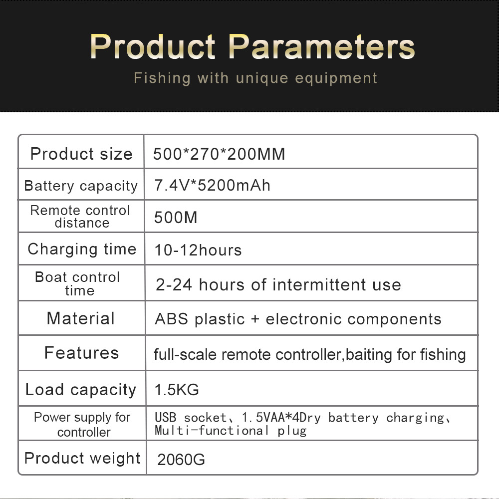| Basic information | Brand: Flytec Model:V500 Speed:5.4km/h | Power system | Esc: brush Motor:Brush double motor |