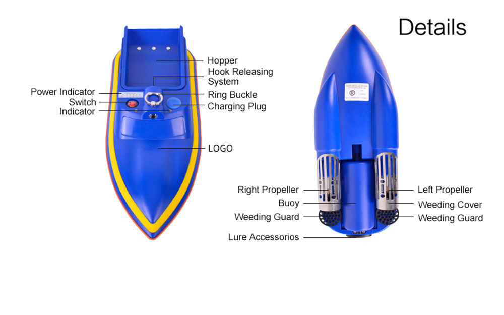 | Other | Front LED Light Hopper capacity:0.5kg Net Weight:1.7kg(including the battery) | Dimension | Boat Size:409*149*148mm Hopper Size:140*89* Box Size:500*220*200mm |