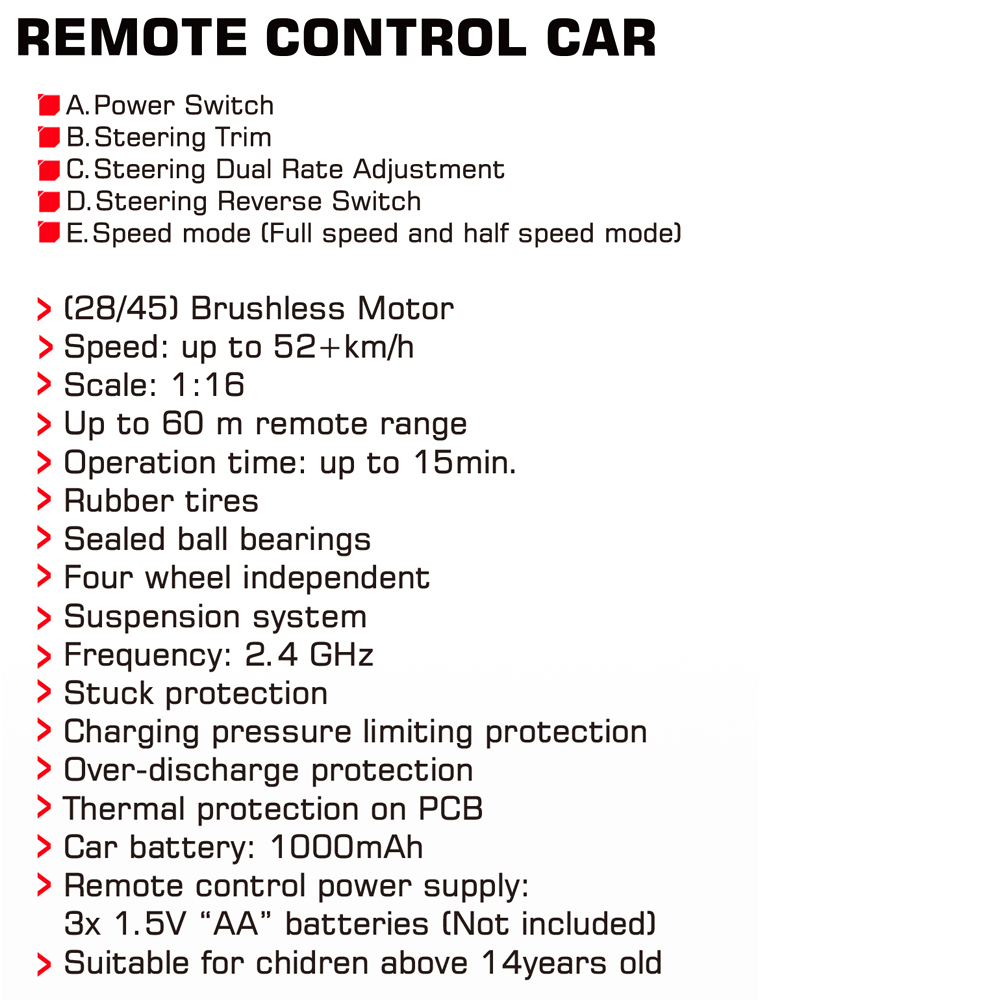 | Basic information | Brand:Xinlehong Q903 Model:1/16 Speed:52km/h | Power system | Esc: brush Motor:Brushless motor |