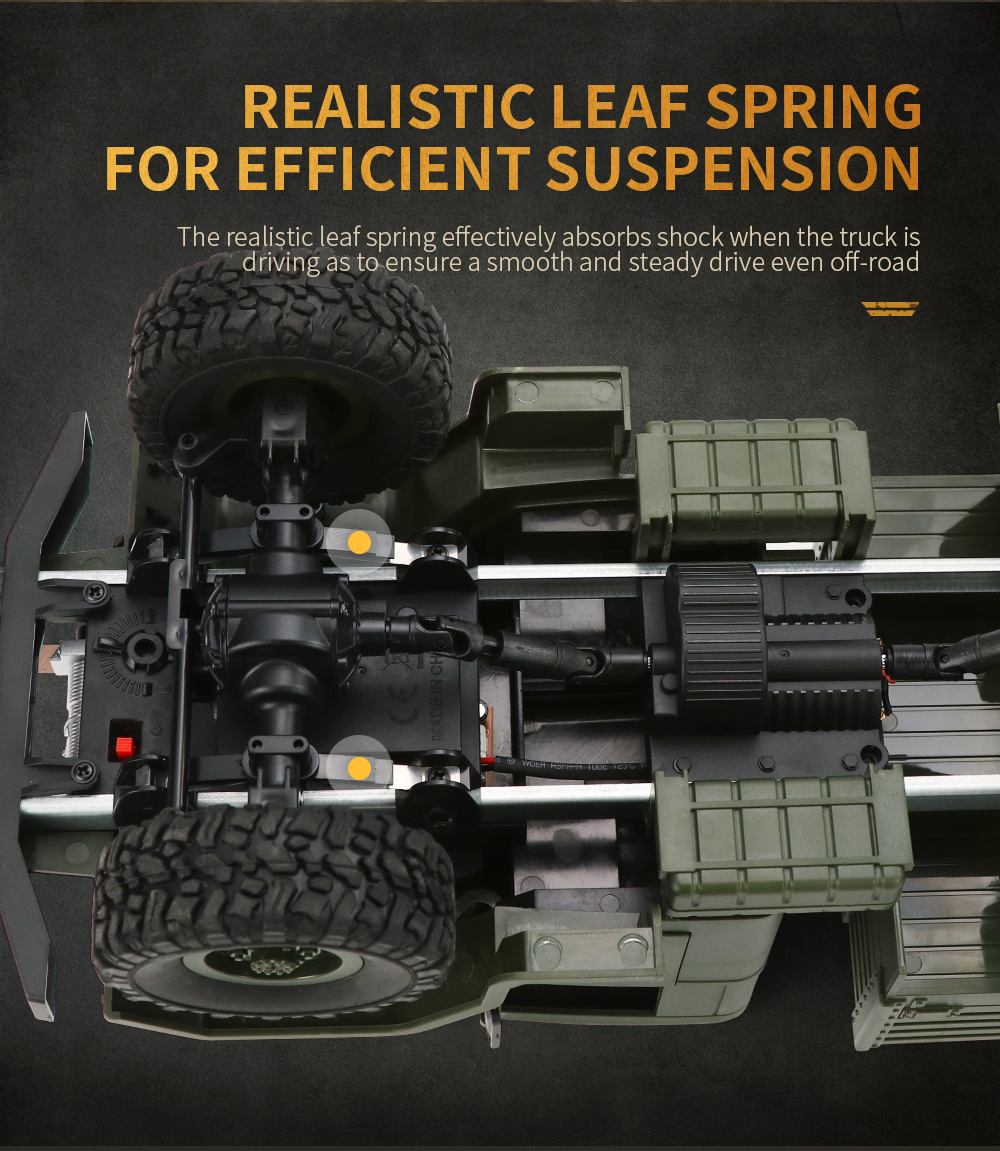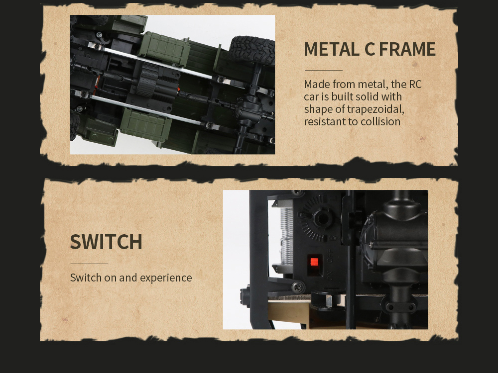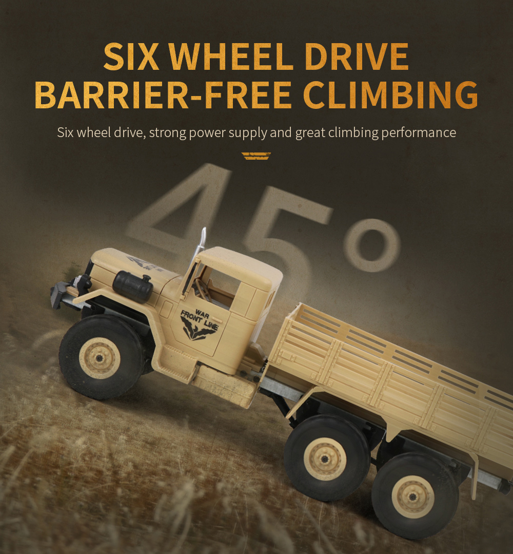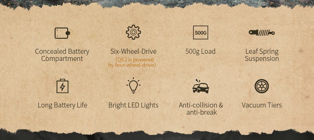 Feature: Forward and backward, turn left and right, high and low speed Six-wheel universal drive shaft drive to simulate original car spring suspension Speed can be controlled fast, strong power, good climbing performance. The front and rear beveled differential makes the turn more stable, allowing the car to move forward at a better speed. It can transport items within a range of about 40 meters, with a load of 500g, which makes the simulation more interactive. The drive motor uses an iron cover motor to make the car last longer.