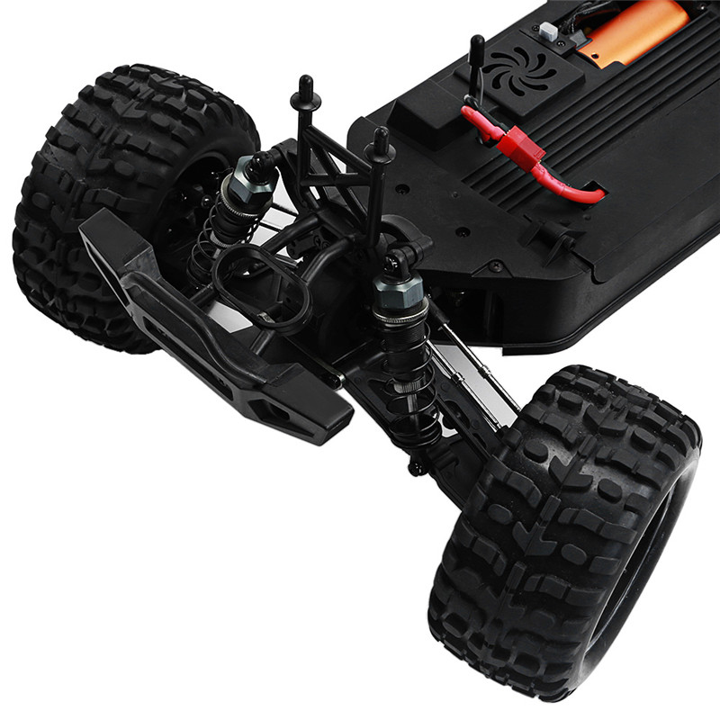 All metal chassis CNC processing, metal adjustable rod, 77T metal reduction gear. Front bumper board has reserved LED lamp holes (for DIY), rear wheel is equipped with the head wheel, to prevent rollovers effectively This rc car is totally waterproof,but if you run it in the salt water,it will get rusty
