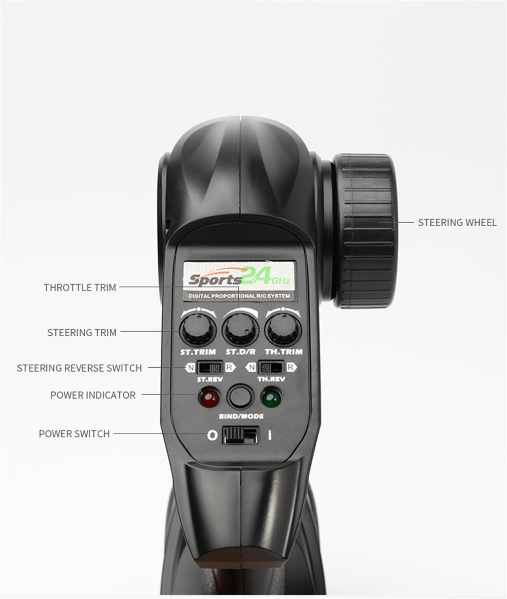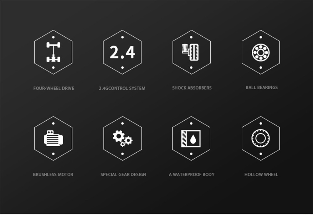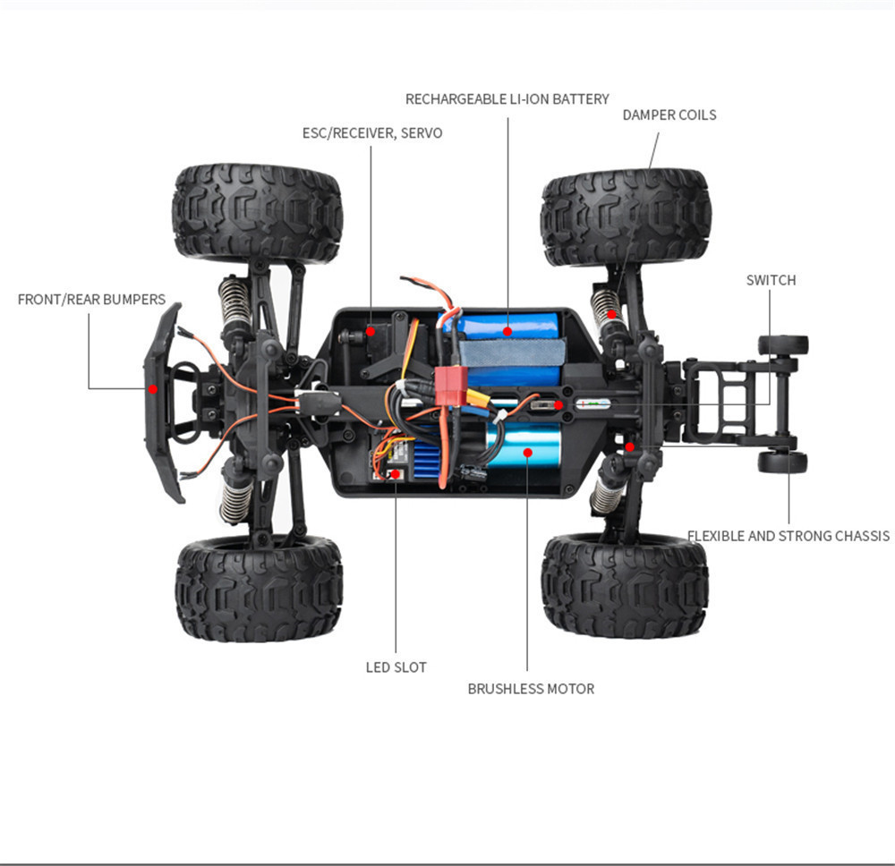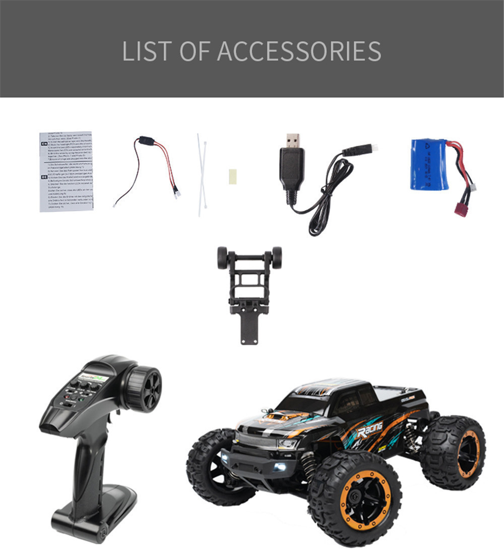 1.2.4GHz Proportional Radio System (full function transmitter, Brushless ESC/Receiver in one unit with 3-wire steering Servo 2.Indepentent Suspension Front/Rear 3.7.4V, 1300mAH , Li-ion Battery Pack with USB charger 4.Ball Bearing Throughout, Gear Diff. 5. Shocks with Aluminum ring for adjustable spring travel tension, which helps to reduce or enhance suspension travel. 6. LED headlight , not installed on the car, is provided as a gift in the package. 7. High Grip Tyres/Spoke Wheels 8. Wheelie Bar included, not installed on the car, provided as a gift in the package.
