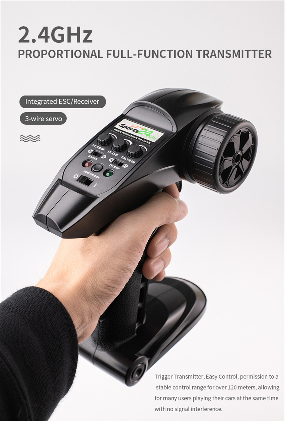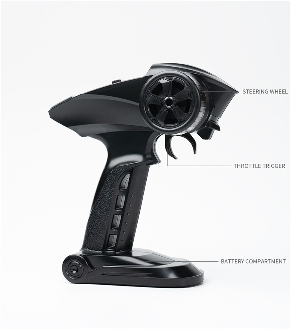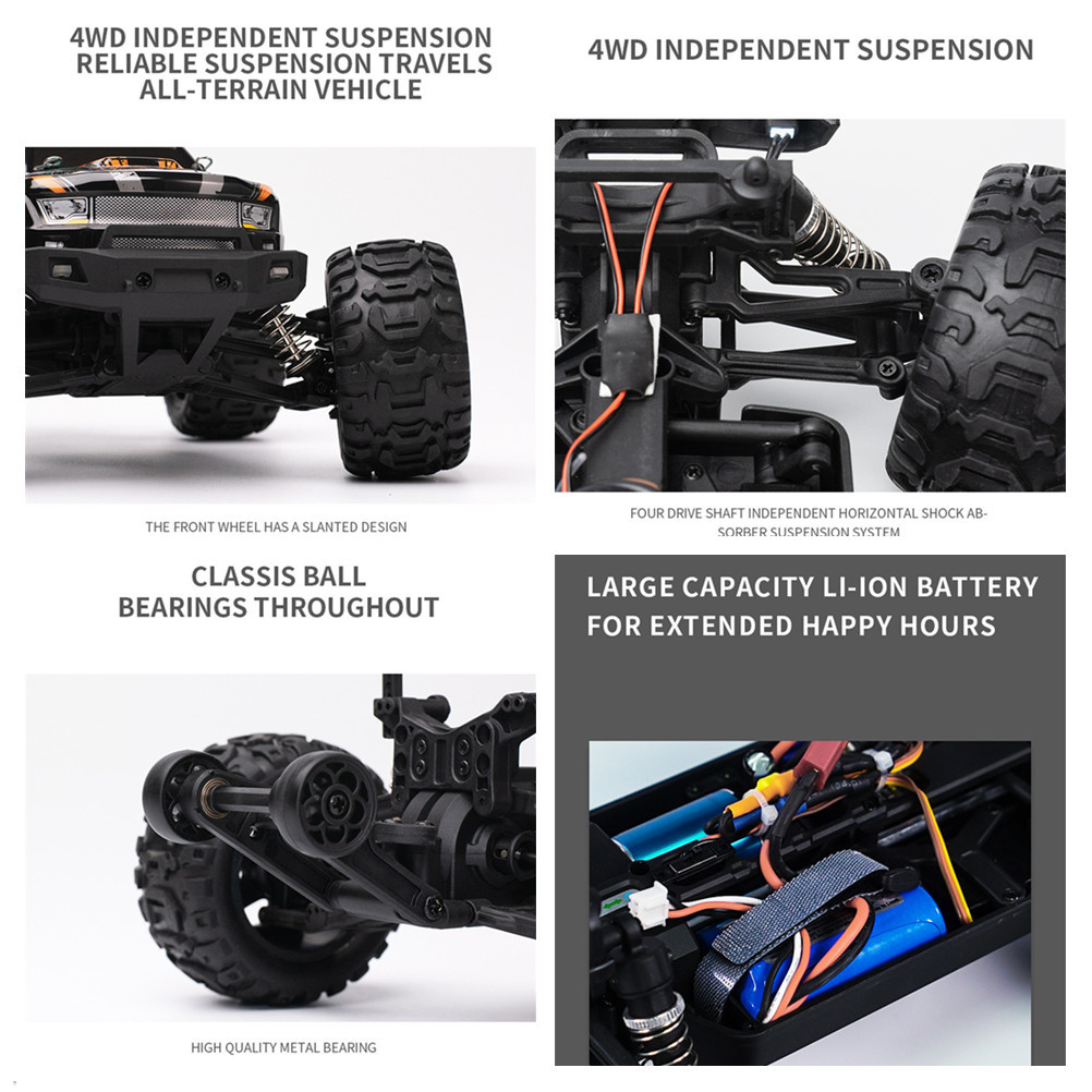 1.2.4GHz Proportional Radio System (full function transmitter, Brushless ESC/Receiver in one unit with 3-wire steering Servo 2.Indepentent Suspension Front/Rear 3.7.4V, 1300mAH , Li-ion Battery Pack with USB charger 4.Ball Bearing Throughout, Gear Diff. 5. Shocks with Aluminum ring for adjustable spring travel tension, which helps to reduce or enhance suspension travel. 6. LED headlight , not installed on the car, is provided as a gift in the package. 7. High Grip Tyres/Spoke Wheels 8. Wheelie Bar included, not installed on the car, provided as a gift in the package.