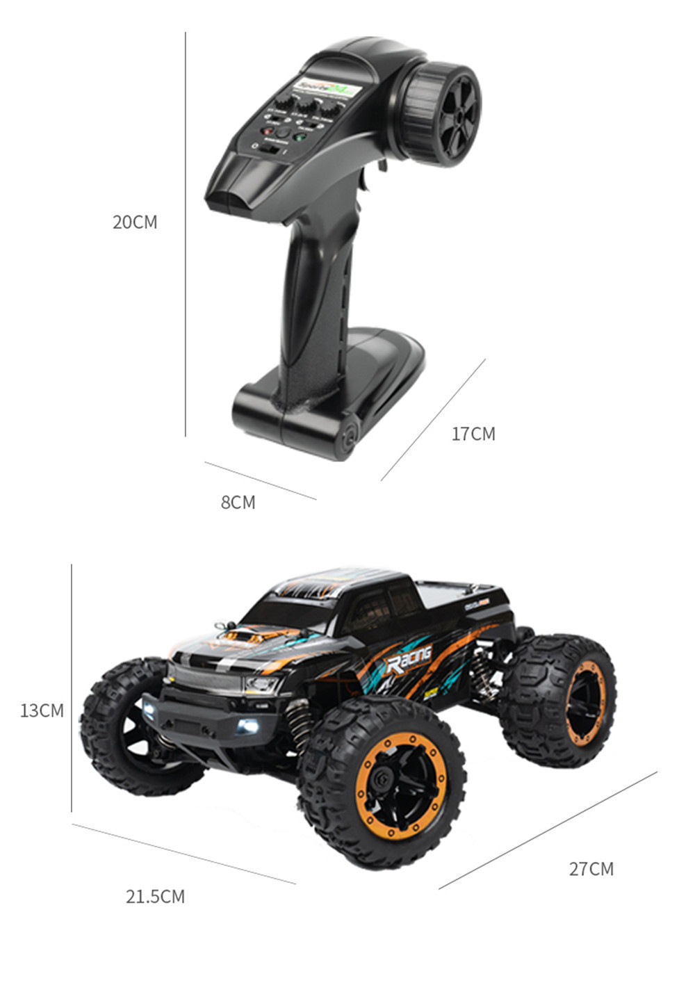Car Size:270*215*130mm Wheelbase:175mm Wheel Diameter:78mm Wheel Width:41mm Gear Ratio:1:10.71