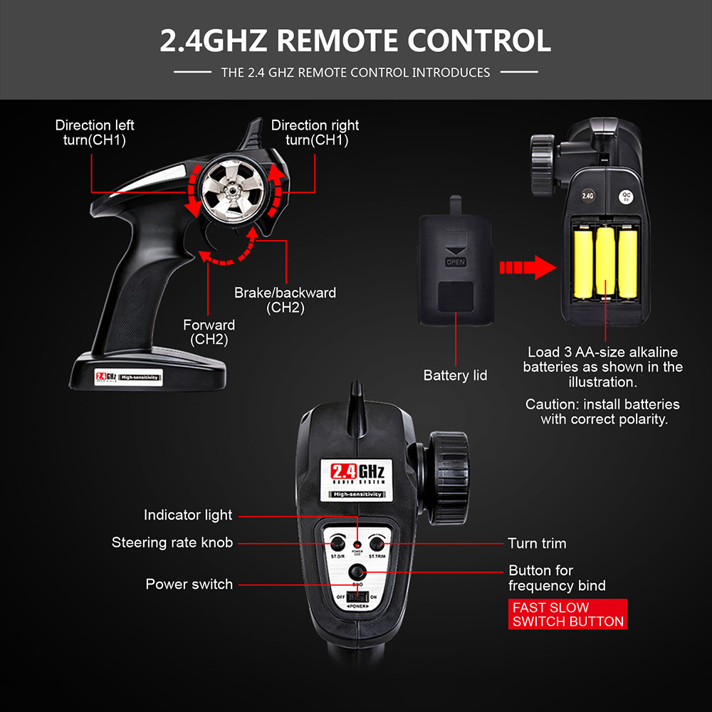 | Transmitter | Frequency: 2.4G Channel: 4CH Control distance:about 50m Battery:3X AA(not included) | Battery | Battery: 7.4V 1500mAh Li-ion(included) Using time:about 20minutes Charging time:about 180minutes Ground Running time:about 15mins |