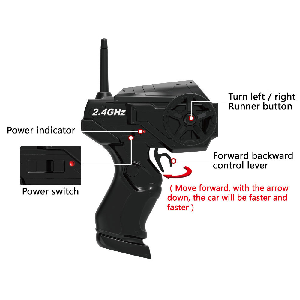 | Transmitter | Frequency: 2.4G Battery:2X1.5V AA(not included) Remote Distance:About 60m | Battery | Car Battery: 3.6V 700mAh Ni-cd battery(included) Charging Time:About 3-4 hours UsingTime:About 20 minutes |