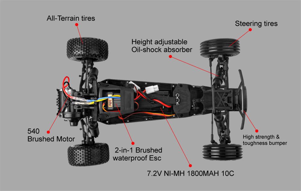 | Transmitter | Frequency: 2.4G Channel: 2CH Battery:4X AA(not included) | Battery | Car Battery:7.2V 1800mAh Ni-MH battery(included) Charging Time:About 4 hours Using Time:About 20 minutes |