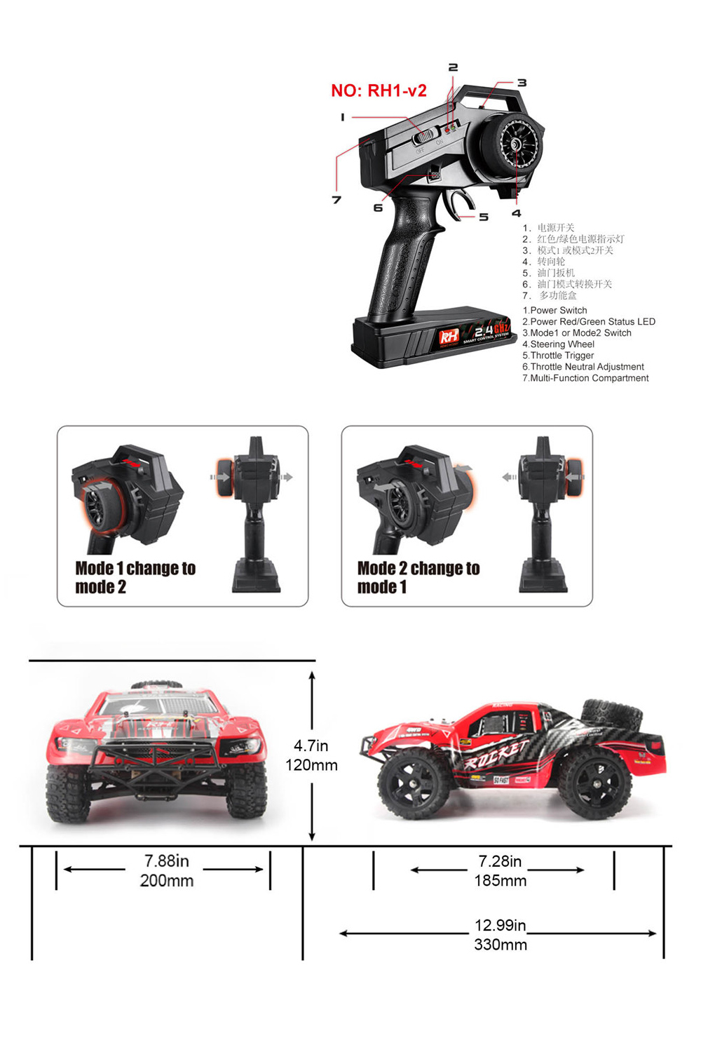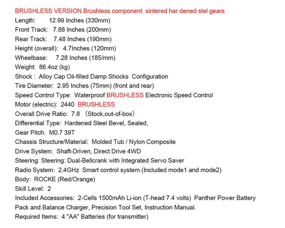 | Transmitter | Frequency:2.4G Battery: 4XAA battery(not included) | Battery: | 7.2v 1500mAH |