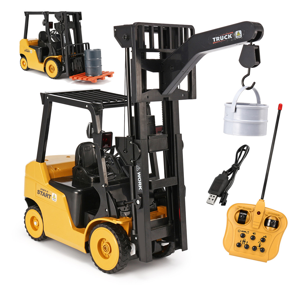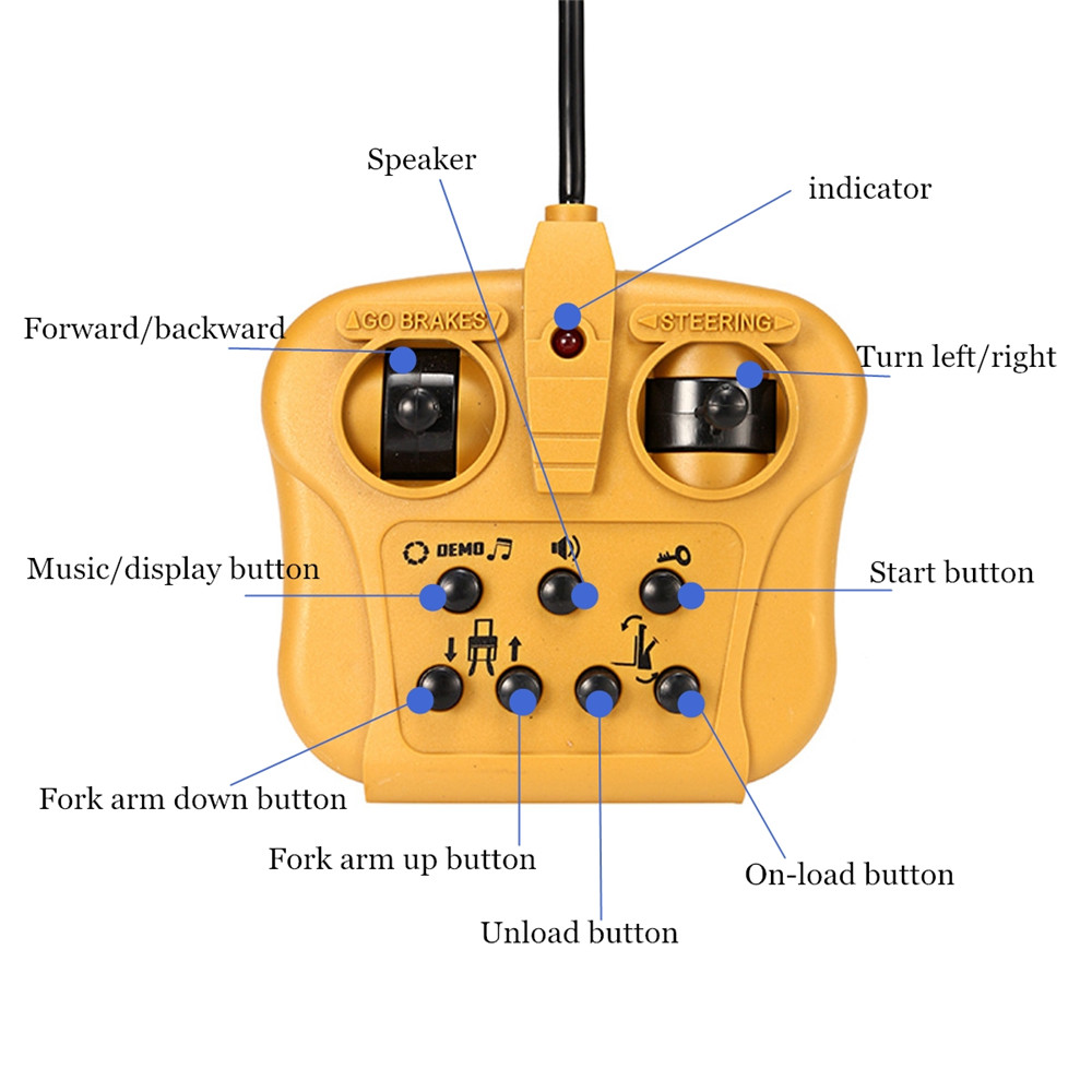 Function: 1.Forward, backward, turn left, turn right, 2.Free demonstration 3.Lighting design, 3 Songs 4.Remotely disassemble into a forklift or crane 5.Remote lift, loading, unloading