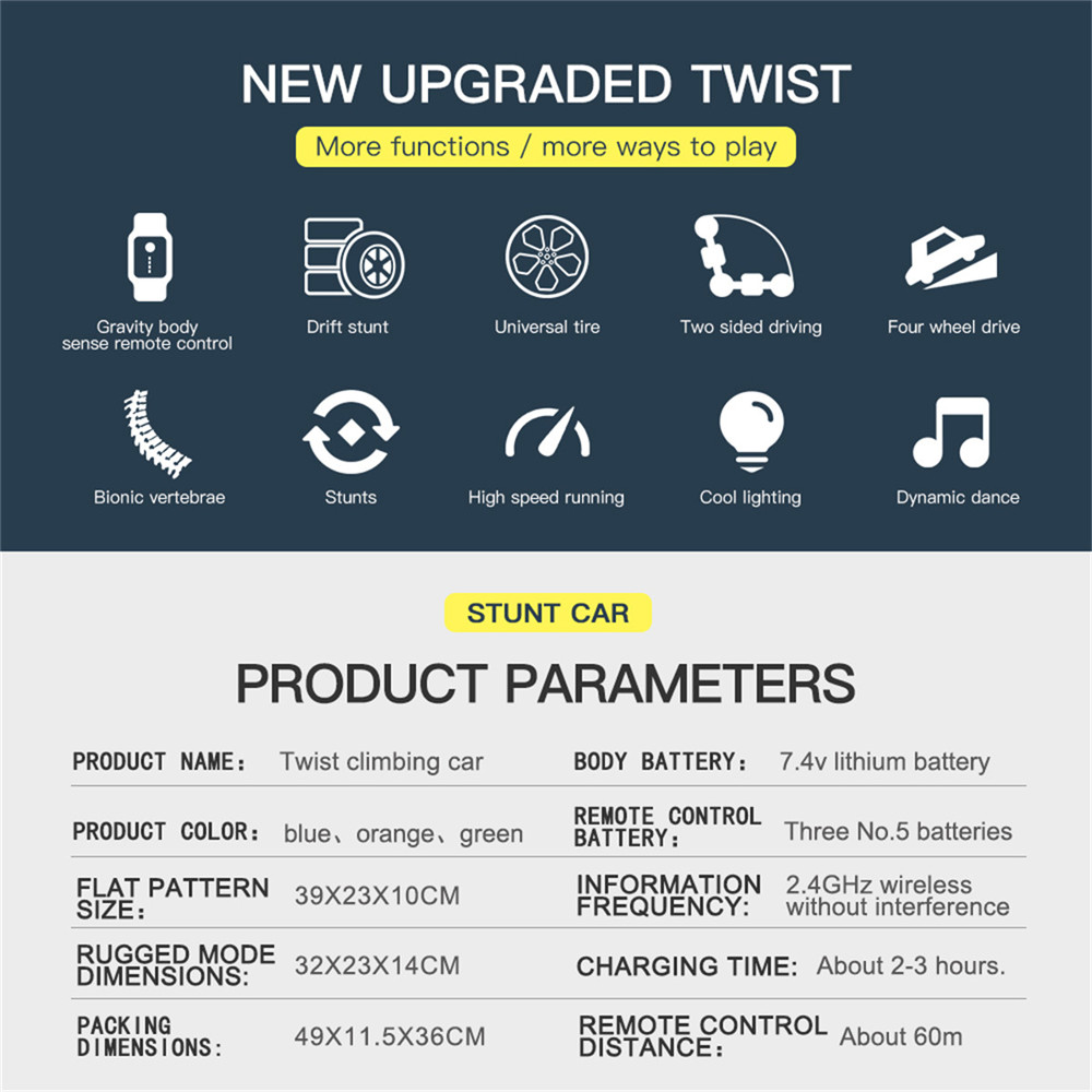 Upgraded RC Stunt Car Toy: Newest Stunt Car Double Sided Roll,four-wheel drive climbing stunt car light music electric double-sided special effects toys. The cool action and unlimited fun,giving the child a wonderful operating experience and visual effects.