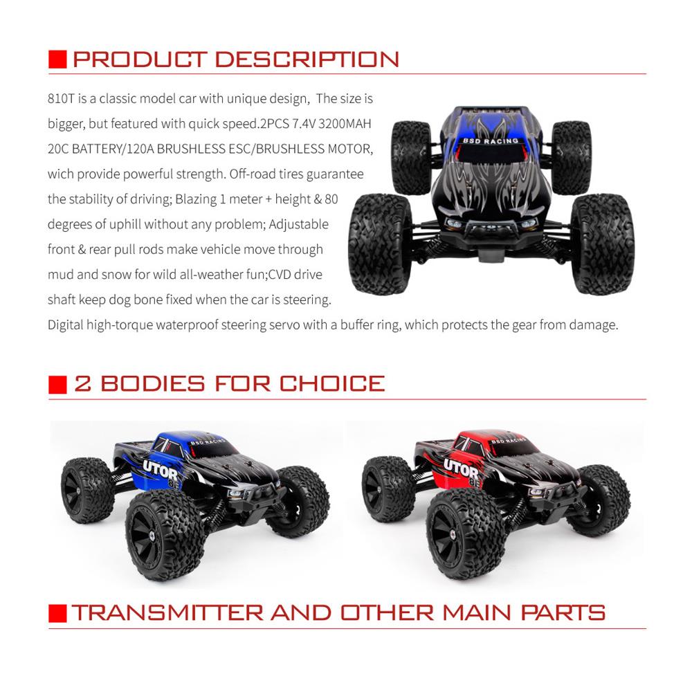 | Basic information | Brand:BSD Racing Item No:BS810T Scale:1/8 Color:Blue and red Max Speed:70km/h | Power System | ESC: 120A brushless esc Motor:3674 brushless motor Servo:9KG waterproof servo |