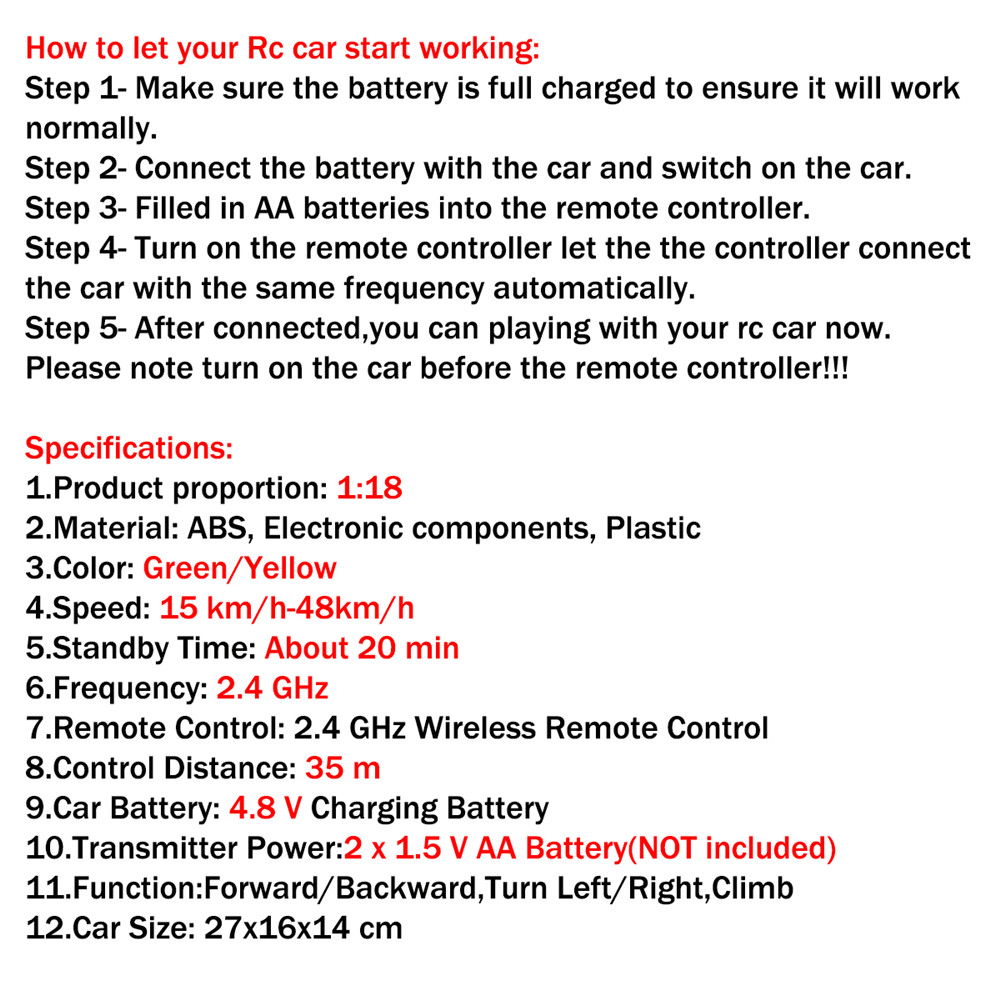 | Transmitter | Frequency: 2.4G | Battery | Battery:Li 4.8V 600Mah Transmitter battery:2x1.5AA(not included) |