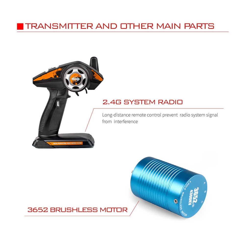 | Basic information | Brand:BSD Racing Item No:404T Scale:1/4 Color:Orange and yellow Max Speed:60km/h | Power System | ESC:Hobby wing brushless waterproof 50A esc Motor:Brushless waterproof 3652 4300kv motor Servo:4.5kg waterproof servo |