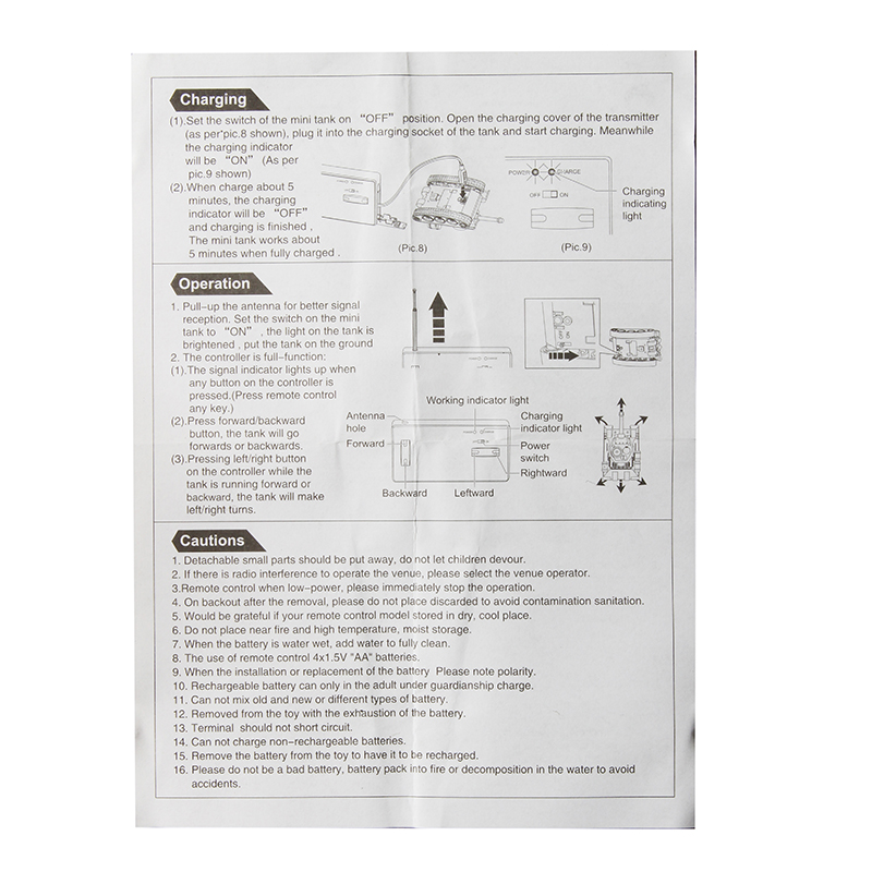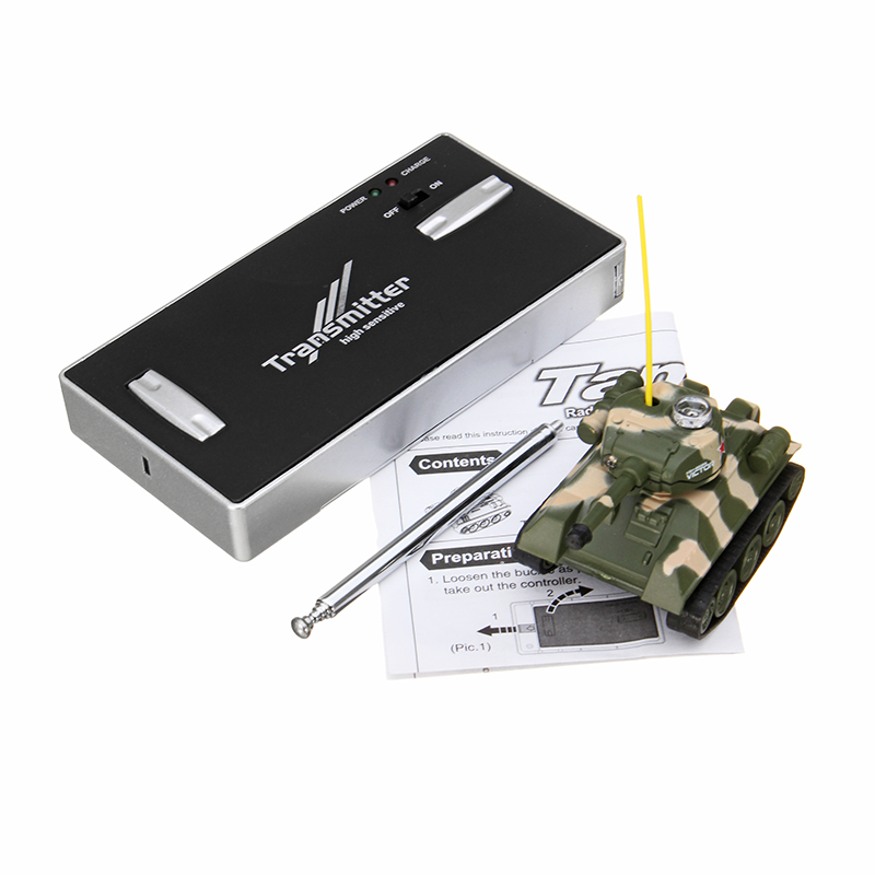 | Transmitter | Frequency: 27MHZ Channel: 2CH Battery:4x 1.5VAA(not included) Remote distance:5m Remote frequency: 49 MHz | Battery | Battery: 2.4V 70mAh Lipo(included) Battery Using time:about 5-7minutes Battery Charging Time: about 5minutes Remote control tank charging method: use the remote control to charge |