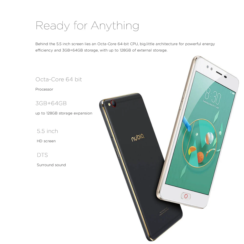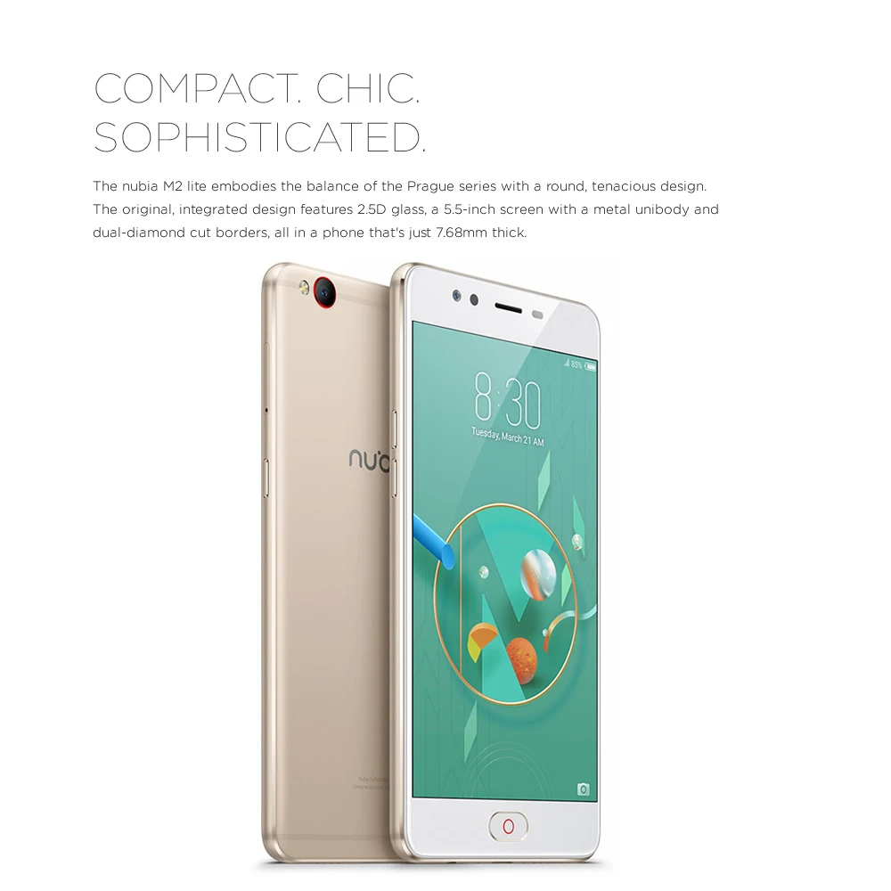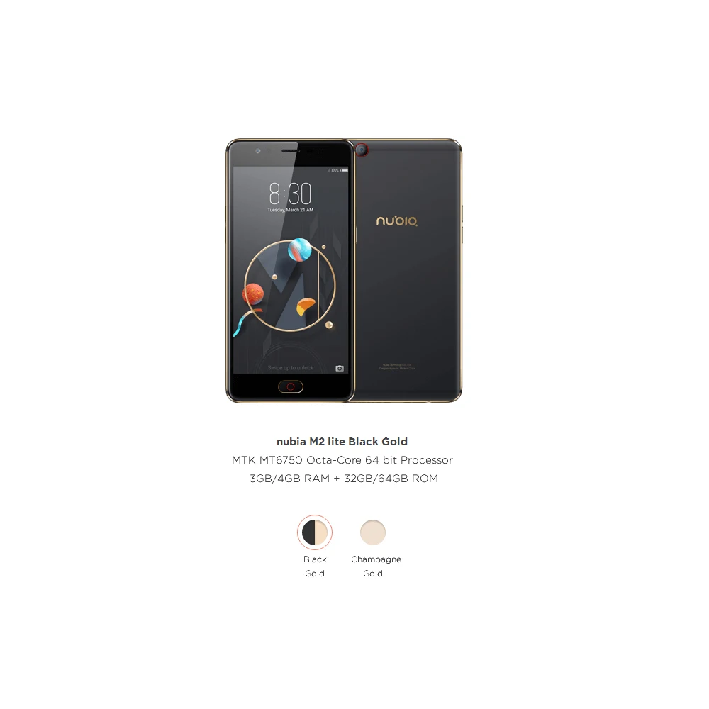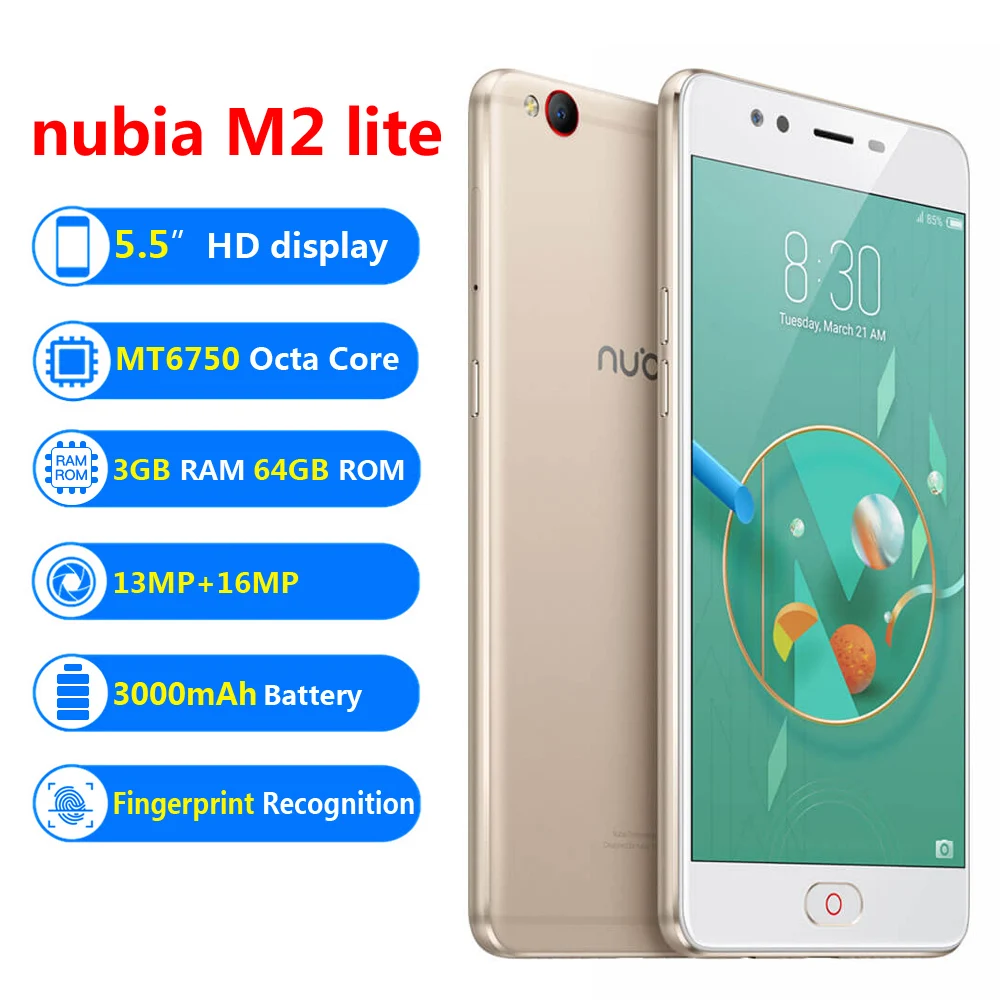 nubia M2 lite features a stylish and exquisite looking, ultra thin body combined with delicate workmanship, deliver high-end texture and smooth touch. With MT6750 octa core processor, 3GB+64GB and support TF card up to 128GB, gives you fast operation. 13MP rear camera and 16MP front camera will record every significant moments in your life clearly.